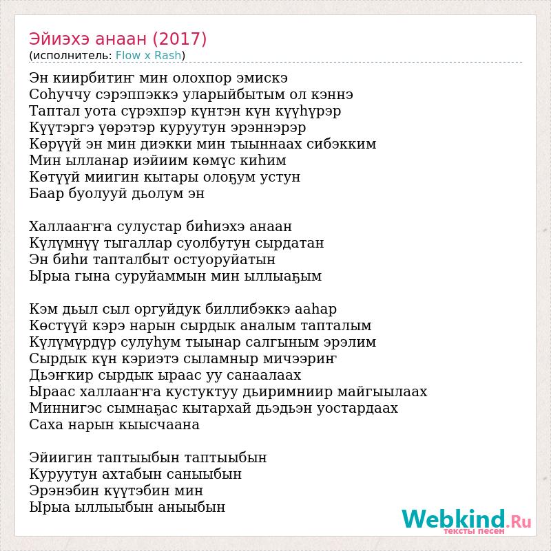 Эн киирбитиҥ мин олохпор эмискэ Соһуччу сэрэппэккэ уларыйбытым ол кэннэ Таптал уота сүрэхпэр күнтэн күн күүһүрэр Күүтэргэ үөрэтэр куруутун эрэннэрэр Көрүүй эн мин диэкки мин тыыннаах сибэкким Мин ылланар иэйиим көмүс киһим Көтүүй миигин кытары олоҕум устун Баар буолууй дьолум эн Халлааҥҥа сулустар биһиэхэ анаан Күлүмнүү тыгаллар суолбутун сырдатан Эн биһи тапталбыт остуоруйатын Ырыа гына суруйаммын мин ыллыаҕым Кэм дьыл сыл оргуйдук биллибэккэ ааһар Көстүүй кэрэ нарын сырдык аналым тапталым Күлүмүрдүр сулуһум тыынар салгыным эрэлим Сырдык күн кэриэтэ сыламныр мичээриҥ Дьэҥкир сырдык ыраас уу санаалаах Ыраас халлааҥҥа кустуктуу дьиримниир майгыылаах Миннигэс сымнаҕас кытархай дьэдьэн уостардаах Саха нарын кыысчаана Эйиигин таптыыбын таптыыбын Куруутун ахтабын саныыбын Эрэнэбин күүтэбин мин Ырыа ыллыыбын аныыбын