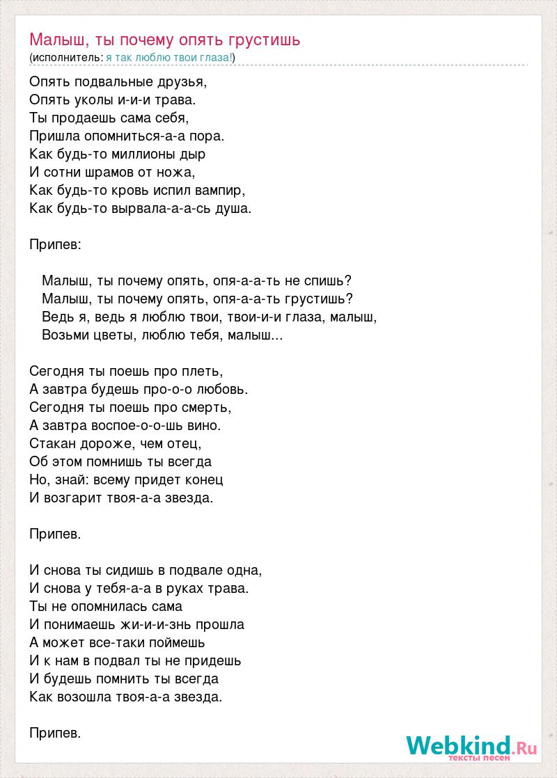 Опять подвальные друзья, Опять уколы и-и-и трава. Ты продаешь сама себя, Пришла опомниться-а-а пора. Как будь-то миллионы дыр И сотни шрамов от ножа, Как будь-то кровь испил вампир, Как будь-то вырвала-а-а-сь душа. Припев: Малыш, ты почему опять, опя-а-а-ть не спишь? Малыш, ты почему опять, опя-а-а-ть грустишь? Ведь я, ведь я люблю твои, твои-и-и глаза, малыш, Возьми цветы, люблю тебя, малыш... Сегодня ты поешь про плеть, А завтра будешь про-о-о любовь. Сегодня ты поешь про смерть, А завтра воспое-о-о-шь вино. Стакан дороже, чем отец, Об этом помнишь ты всегда Но, знай: всему придет конец И возгарит твоя-а-а звезда. Припев. И снова ты сидишь в подвале одна, И снова у тебя-а-а в руках трава. Ты не опомнилась сама И понимаешь жи-и-и-знь прошла А может все-таки поймешь И к нам в подвал ты не придешь И будешь помнить ты всегда Как возошла твоя-а-а звезда. Припев.