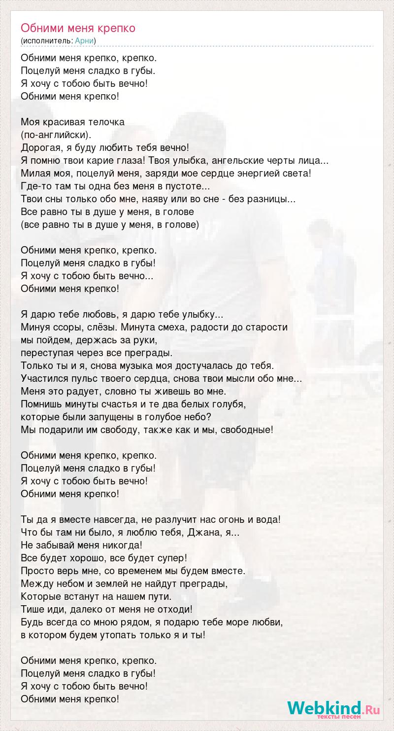 Обними меня крепко, крепко. Поцелуй меня сладко в губы. Я хочу с тобою быть вечно! Обними меня крепко! Моя красивая телочка (по-английски). Дорогая, я буду любить тебя вечно! Я помню твои карие глаза! Твоя улыбка, ангельские черты лица... Милая моя, поцелуй меня, заряди мое сердце энергией света! Где-то там ты одна без меня в пустоте... Твои сны только обо мне, наяву или во сне - без разницы... Все равно ты в душе у меня, в голове (все равно ты в душе у меня, в голове) Обними меня крепко, крепко. Поцелуй меня сладко в губы! Я хочу с тобою быть вечно... Обними меня крепко! Я дарю тебе любовь, я дарю тебе улыбку... Минуя ссоры, слёзы. Минута смеха, радости до старости мы пойдем, держась за руки, переступая через все преграды. Только ты и я, снова музыка моя достучалась до тебя. Участился пульс твоего сердца, снова твои мысли обо мне... Меня это радует, словно ты живешь во мне. Помнишь минуты счастья и те два белых голубя, которые были запущены в голубое небо? Мы подарили им свободу, также как и мы, свободные! Обними меня крепко, крепко. Поцелуй меня сладко в губы! Я хочу с тобою быть вечно! Обними меня крепко! Ты да я вместе навсегда, не разлучит нас огонь и вода! Что бы там ни было, я люблю тебя, Джана, я... Не забывай меня никогда! Все будет хорошо, все будет супер! Просто верь мне, со временем мы будем вместе. Между небом и землей не найдут преграды, Которые встанут на нашем пути. Тише иди, далеко от меня не отходи! Будь всегда со мною рядом, я подарю тебе море любви, в котором будем утопать только я и ты! Обними меня крепко, крепко. Поцелуй меня сладко в губы! Я хочу с тобою быть вечно! Обними меня крепко!