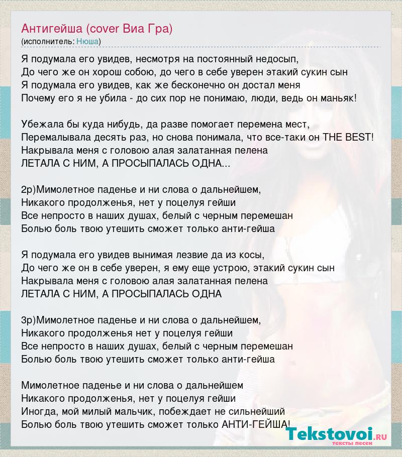 Я подумала его увидев, несмотря на постоянный недосып, До чего же он хорош собою, до чего в себе уверен этакий сукин сын Я подумала его увидев, как же бесконечно он достал меня Почему его я не убила - до сих пор не понимаю, люди, ведь он маньяк! Убежала бы куда нибудь, да разве помогает перемена мест, Перемалывала десять раз, но снова понимала, что все-таки он THE BEST! Накрывала меня с головою алая залатанная пелена ЛЕТАЛА С НИМ, А ПРОСЫПАЛАСЬ ОДНА... 2р)Мимолетное паденье и ни слова о дальнейшем, Никакого продолженья, нет у поцелуя гейши Все непросто в наших душах, белый с черным перемешан Болью боль твою утешить сможет только анти-гейша Я подумала его увидев вынимая лезвие да из косы, До чего же он в себе уверен, я ему еще устрою, этакий сукин сын Накрывала меня с головою алая залатанная пелена ЛЕТАЛА С НИМ, А ПРОСЫПАЛАСЬ ОДНА 3р)Мимолетное паденье и ни слова о дальнейшем, Никакого продолженья нет у поцелуя гейши Все непросто в наших душах, белый с черным перемешан Болью боль твою утешить сможет только анти-гейша Мимолетное паденье и ни слова о дальнейшем Никакого продолженья, нет у поцелуя гейши Иногда, мой милый мальчик, побеждает не сильнейший Болью боль твою утешить сможет только АНТИ-ГЕЙША!
