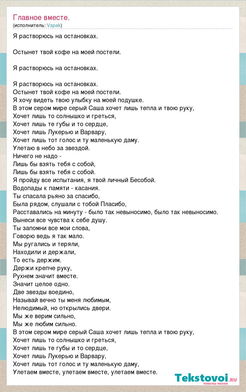 Я растворюсь на остановках. Остынет твой кофе на моей постели. Я растворюсь на остановках. Я растворюсь на остановках. Остынет твой кофе на моей постели. Я хочу видеть твою улыбку на моей подушке. В этом сером мире серый Саша хочет лишь тепла и твою руку, Хочет лишь то солнышко и греться, Хочет лишь те губы и то сердце, Хочет лишь Лукерью и Варвару, Хочет лишь тот голос и ту маленькую даму. Улетаю в небо за звездой. Ничего не надо - Лишь бы взять тебя с собой, Лишь бы взять тебя с собой. Я пройду все испытания, я твой личный Бесобой. Водопады к памяти - касания. Ты спасала рьяно за спасибо, Была рядом, слушали с тобой Пласибо, Расставались на минуту - было так невыносимо, было так невыносимо. Вынеси все чувства к себе душу. Ты запомни все мои слова, Говорю ведь я так мало. Мы ругались и теряли, Находили и держали, То есть держим. Держи крепче руку, Рухнем значит вместе. Значит целое одно. Две звезды воедино, Называй вечно ты меня любимым, Нелюдимый, но открылись двери. Мы же верим сильно, Мы же любим сильно. В этом сером мире серый Саша хочет лишь тепла и твою руку, Хочет лишь то солнышко и греться, Хочет лишь те губы и то сердце, Хочет лишь Лукерью и Варвару, Хочет лишь тот голос и ту маленькую даму, Улетаем вместе, улетаем вместе, улетаем вместе.
