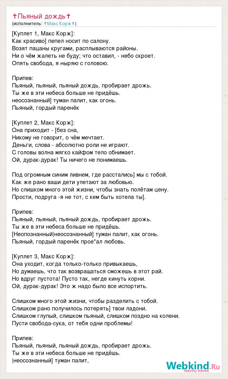 [Куплет 1, Макс Корж]: Как красиво] пепел носит по салону. Возят пацаны кругами, расплываются районы. Ни о чём жалеть не буду; что оставил, - небо скроет. Опять свобода, я ныряю с головою. Припев: Пьяный, пьяный, пьяный дождь, пробирает дрожь. Ты же в эти небеса больше не придёшь. неосознанный] туман палит, как огонь. Пьяный, гордый паренёк [Куплет 2, Макс Корж]: Она приходит - [без сна, Никому не говорит, о чём мечтает. Деньги, слова - абсолютно роли не играют. С головы волна мягко кайфом тело обнимает. Ой, дурак-дурак! Ты ничего не понимаешь. Под огромным синим ливнем, где расстались] мы с тобой. Как же рано ваши дети улетают за любовью. Но слишком много этой жизни, чтобы знать полётам цену. Прости, подруга -я не тот, с кем быть хотела ты]. Припев: Пьяный, пьяный, пьяный дождь, пробирает дрожь. Ты же в эти небеса больше не придёшь. [Неопознанный|неосознанный] туман палит, как огонь. Пьяный, гордый паренёк прое*ал любовь. [Куплет 3, Макс Корж]: Она уходит, когда только-только привыкаешь, Но думаешь, что так возвращаться сможешь в этот рай. Но вдруг пустота! Пусто так, негде кинуть корни. Ой, дурак-дурак! Это ж надо было все испортить. Слишком много этой жизни, чтобы разделить с тобой. Слишком рано получилось потерять] твои ладони. Слишком глупый, слишком пьяный, слишком поздно на колени. Пусти свобода-сука, от тебя одни проблемы! Припев: Пьяный, пьяный, пьяный дождь, пробирает дрожь. Ты же в эти небеса больше не придёшь. |неосознанный] туман палит,