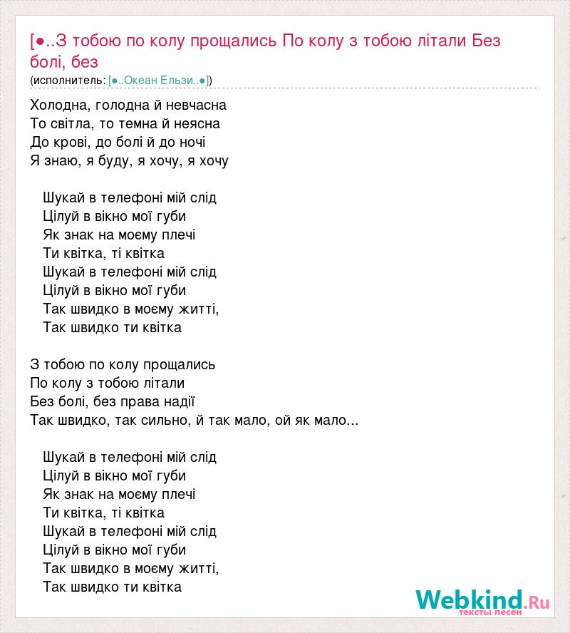 Холодна, голодна й невчасна То свiтла, то темна й неясна До кровi, до болi й до ночi Я знаю, я буду, я хочу, я хочу Шукай в телефонi мiй слiд Цiлуй в вiкно мої губи Як знак на моєму плечi Ти квiтка, тi квiтка Шукай в телефонi мiй слiд Цiлуй в вiкно мої губи Так швидко в моєму життi, Так швидко ти квiтка З тобою по колу прощались По колу з тобою лiтали Без болi, без права надiї Так швидко, так сильно, й так мало, ой як мало... Шукай в телефонi мiй слiд Цiлуй в вiкно мої губи Як знак на моєму плечi Ти квiтка, тi квiтка Шукай в телефонi мiй слiд Цiлуй в вiкно мої губи Так швидко в моєму життi, Так швидко ти квiтка