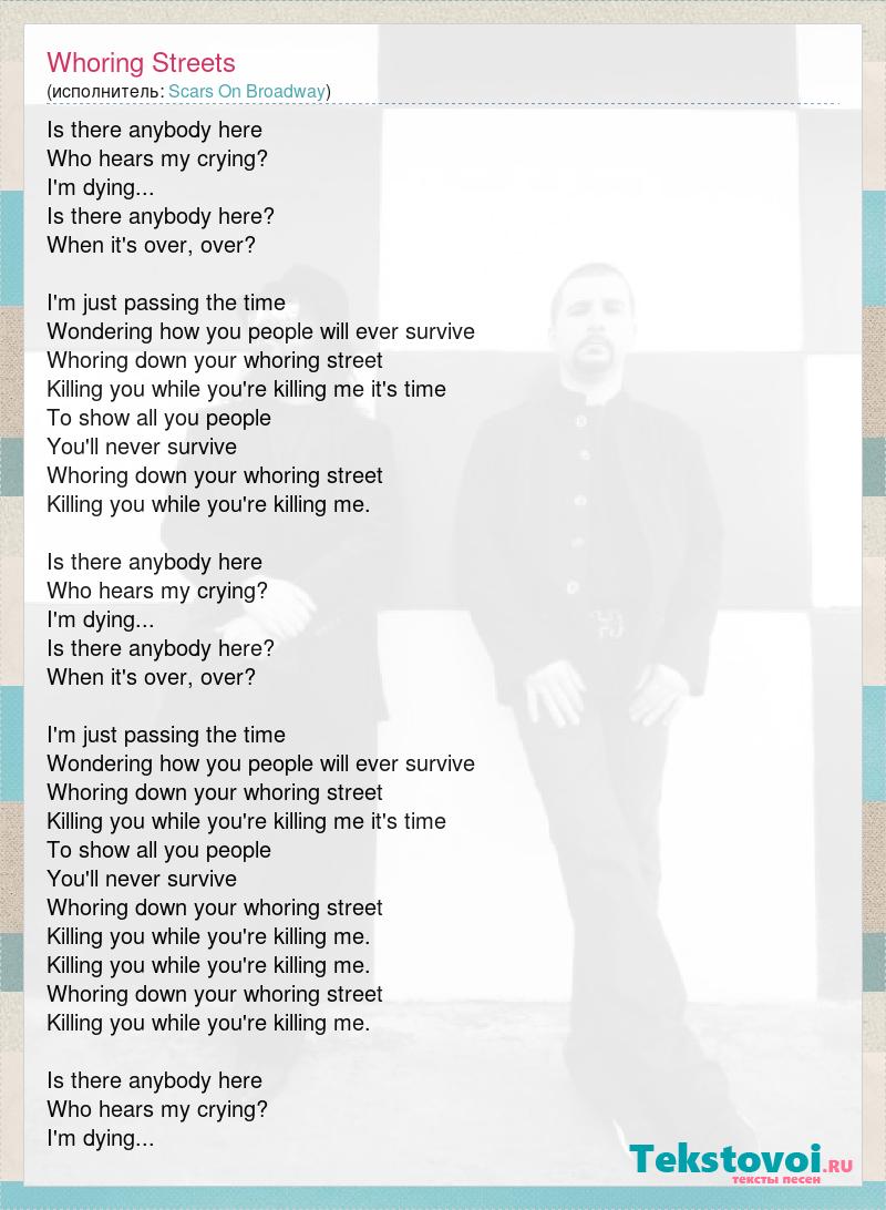 Is there anybody here Who hears my crying? I'm dying... Is there anybody here? When it's over, over? I'm just passing the time Wondering how you people will ever survive Whoring down your whoring street Killing you while you're killing me it's time To show all you people You'll never survive Whoring down your whoring street Killing you while you're killing me. Is there anybody here Who hears my crying? I'm dying... Is there anybody here? When it's over, over? I'm just passing the time Wondering how you people will ever survive Whoring down your whoring street Killing you while you're killing me it's time To show all you people You'll never survive Whoring down your whoring street Killing you while you're killing me. Killing you while you're killing me. Whoring down your whoring street Killing you while you're killing me. Is there anybody here Who hears my crying? I'm dying...