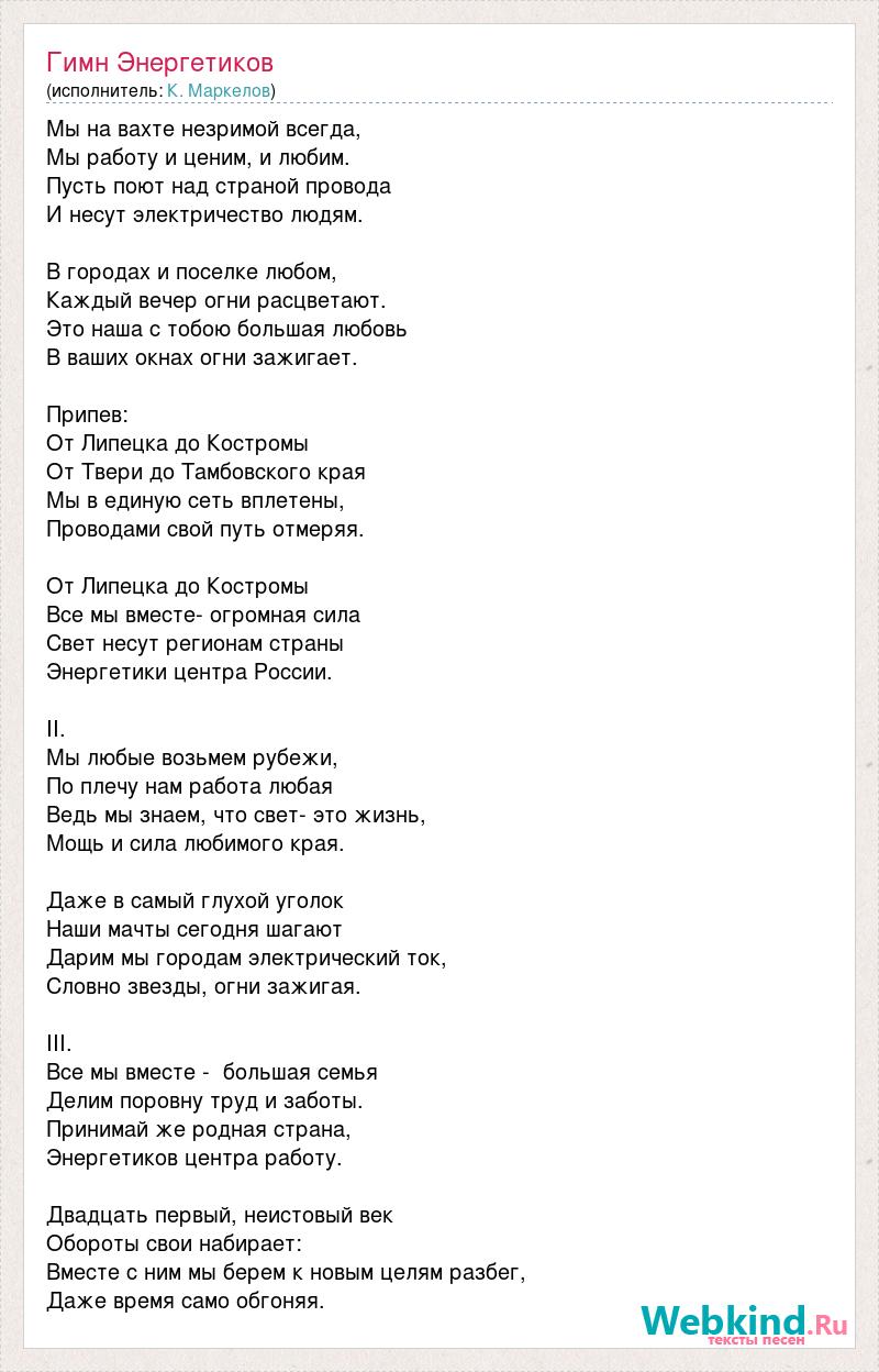 Мы на вахте незримой всегда, Мы работу и ценим, и любим. Пусть поют над страной провода И несут электричество людям. В городах и поселке любом, Каждый вечер огни расцветают. Это наша c тобою большая любовь В ваших окнах огни зажигает. Припев: От Липецка до Костромы От Твери до Тамбовского края Мы в единую сеть вплетены, Проводами свой путь отмеряя. От Липецка до Костромы Все мы вместе- огромная сила Свет несут регионам страны Энергетики центра России. II. Мы любые возьмем рубежи, По плечу нам работа любая Ведь мы знаем, что свет- это жизнь, Мощь и сила любимого края. Даже в самый глухой уголок Наши мачты сегодня шагают Дарим мы городам электрический ток, Словно звезды, огни зажигая. III. Все мы вместе - большая семья Делим поровну труд и заботы. Принимай же родная страна, Энергетиков центра работу. Двадцать первый, неистовый век Обороты свои набирает: Вместе с ним мы берем к новым целям разбег, Даже время само обгоняя.