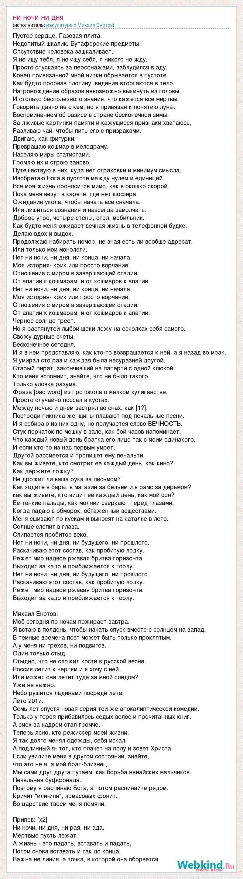 Пустое сердце. Газовая плита. Недопитый шкалик. Бутафорские предметы. Отсутствие человека зашкаливает. Я не ищу тебя, я не ищу себя, я никого не жду. Просто спускаясь за персонажами, заблудился в аду. Конец привязанной мной нитки обрывается в пустоте. Как будто прорвав плотину, видения вторгаются в тело. Нагромождение образов невозможно выкинуть из головы. И столько бесполезного знания, что кажется все мертвы. Говорить давно не с кем, но я привязан к понятию луны. Воспоминанием об оазисе в стране бесконечной зимы. За лживые картинки памяти и кажущиеся признаки хватаюсь, Разливаю чай, чтобы пить его с призраками. Двигаю, как фигурки. Превращаю кошмар в мелодраму. Населяю миры статистами. Громлю их и строю заново. Путешествую в них, куда нет страховки и минимум смысла. Изобретаю Бога в пустоте между нулем и единицей. Вся моя жизнь проносится мимо, как в окошко скорой. Пока меня везут в карете, где нет шофера. Ожидание укола, чтобы начать все сначала. Или лишиться сознания и навсегда замолчать. Доброе утро, четыре стены, стол, мобильник. Как будто меня ожидает вечная жизнь в телефонной будке. Делаю вдох и выдох. Продолжаю набирать номер, не зная есть ли вообще адресат. Или только мои монологи. Нет ни ночи, ни дня, ни конца, ни начала. Моя история- крик или просто ворчание. Отношения с миром в завершающей стадии. От апатии к кошмарам, и от кошмаров к апатии. Нет ни ночи, ни дня, ни конца, ни начала. Моя история- крик или просто ворчание. Отношения с миром в завершающей стадии. От апатии к кошмарам, и от кошмаров к апатии. Черное солнце греет. Но я растянутой лыбой щеки лежу на осколках себя самого. Свожу дурные счеты. Бесконечное сегодня. И я в нем представляю, как кто-то возвращается к ней, а я назад во мрак. Я умирал сто раз и каждая была несуразней другой. Старый пират, закончивший на паперти с одной клюкой. Кто меня вспомнит, знайте, что не было такого. Только уловка разума. Фраза [bad word] из протокола о мелком хулиганстве. Просто случайно поссал в кустах. Между ночью и днем застрял во снах, как [1?]. Постреди пикника женщины плавают под печальные песни. И я собираю из них одну, но получается слово ВЕЧНОСТЬ. Стук перчаток по мешку в зале, как бой часов напоминает, Что каждый новый день братка его лицо так с моим одинакого. И если кто-то из нас первым умрет, Другой рассмеется и пропишет ему пенальти. Как вы живете, кто смотрит ее каждый день, как кино? Как держите ложку? Не дрожит ли ваша рука за письмом? Как ходите в бары, в магазин за бельем и в рамс за дерьмом? как вы живете, кто видит ее каждый день, как мой сон? Ее тонкие пальцы, как молнии сверкают перед глазами, Когда падаю в обморок, обгаженный веществами. Меня сшивают по кускам и выносят на каталке в лето. Солнце слепит в глаза. Слипается пробитое веко. Нет ни ночи, ни дня, ни будущего, ни прошлого. Раскачиваю этот состав, как пробитую лодку. Режет мир надвое ржавая бритва горизонта. Выходит за кадр и приближается к горлу. Нет ни ночи, ни дня, ни будущего, ни прошлого. Раскачиваю этот состав, как пробитую лодку. Режет мир надвое ржавая бритва горизонта. Выходит за кадр и приближается к горлу. Михаил Енотов: Моё сегодня по ночам пожирает завтра. Я встаю в полдень, чтобы начать спуск вместе с солнцем на запад. В темные времена поэт может быть только проклятым. А у меня ни грехов, ни подвигов. Один только стыд. Стыдно, что не сложи