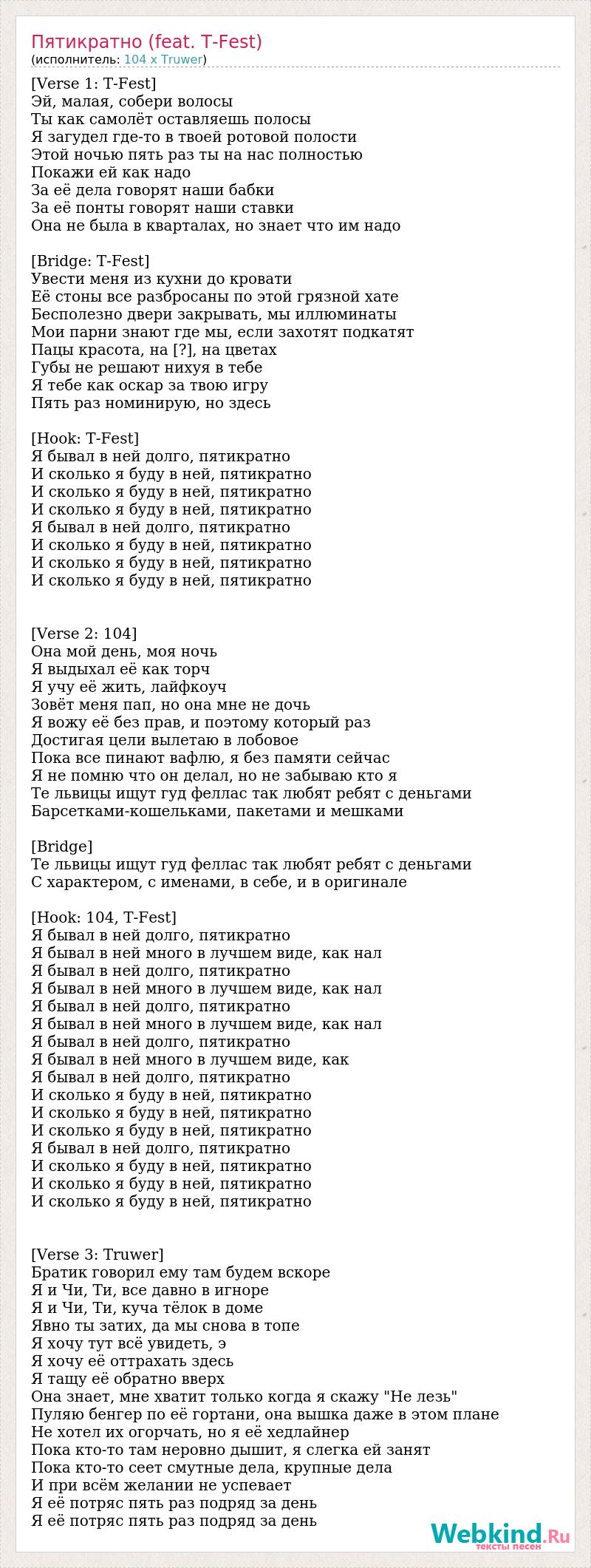 [Verse 1: T-Fest] Эй, малая, собери волосы Ты как самолёт оставляешь полосы Я загудел где-то в твоей ротовой полости Этой ночью пять раз ты на нас полностью Покажи ей как надо За её дела говорят наши бабки За её понты говорят наши ставки Она не была в кварталах, но знает что им надо [Bridge: T-Fest] Увести меня из кухни до кровати Её стоны все разбросаны по этой грязной хате Бесполезно двери закрывать, мы иллюминаты Мои парни знают где мы, если захотят подкатят Пацы красота, на [?], на цветах Губы не решают нихуя в тебе Я тебе как оскар за твою игру Пять раз номинирую, но здесь [Hook: T-Fest] Я бывал в ней долго, пятикратно И сколько я буду в ней, пятикратно И сколько я буду в ней, пятикратно И сколько я буду в ней, пятикратно Я бывал в ней долго, пятикратно И сколько я буду в ней, пятикратно И сколько я буду в ней, пятикратно И сколько я буду в ней, пятикратно [Verse 2: 104] Она мой день, моя ночь Я выдыхал её как торч Я учу её жить, лайфкоуч Зовёт меня пап, но она мне не дочь Я вожу её без прав, и поэтому который раз Достигая цели вылетаю в лобовое Пока все пинают вафлю, я без памяти сейчас Я не помню что он делал, но не забываю кто я Те львицы ищут гуд феллас так любят ребят с деньгами Барсетками-кошельками, пакетами и мешками [Bridge] Те львицы ищут гуд феллас так любят ребят с деньгами С характером, с именами, в себе, и в оригинале [Hook: 104, T-Fest] Я бывал в ней долго, пятикратно Я бывал в ней много в лучшем виде, как нал Я бывал в ней долго, пятикратно Я бывал в ней много в лучшем виде, как нал Я бывал в ней долго, пятикратно Я бывал в ней много в лучшем виде, как нал Я бывал в ней долго, пятикратно Я бывал в ней много в лучшем виде, как Я бывал в ней долго, пятикратно И сколько я буду в ней, пятикратно И сколько я буду в ней, пятикратно И сколько я буду в ней, пятикратно Я бывал в ней долго, пятикратно И сколько я буду в ней, пятикратно И сколько я буду в ней, пятикратно И сколько я буду в ней, пятикратно [Verse 3: Truwer] Братик говорил ему там будем вскоре Я и Чи, Ти, все давно в игноре Я и Чи, Ти, куча тёлок в доме Явно ты затих, да мы снова в топе Я хочу тут всё увидеть, э Я хочу её оттрахать здесь Я тащу её обратно вверх Она знает, мне хватит только когда я скажу "Не лезь" Пуляю бенгер по её гортани, она вышка даже в этом плане Не хотел их огорчать, но я её хедлайнер Пока кто-то там неровно дышит, я слегка ей занят Пока кто-то сеет смутные дела, крупные дела И при всём желании не успевает Я её потряс пять раз подряд за день Я её потряс пять раз подряд за день