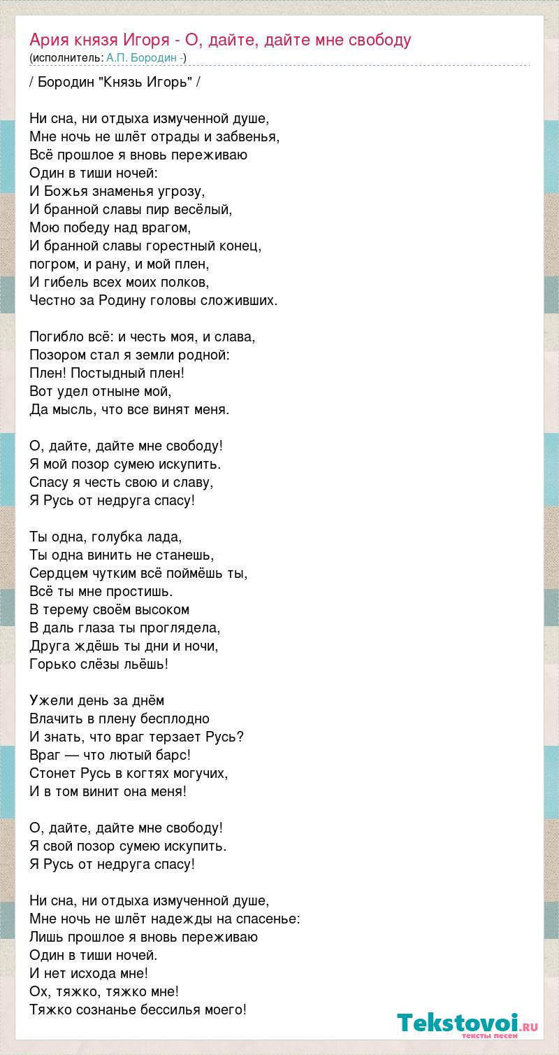/ Бородин "Князь Игорь" / Ни сна, ни отдыха измученной душе, Мне ночь не шлёт отрады и забвенья, Всё прошлое я вновь переживаю Один в тиши ночей: И Божья знаменья угрозу, И бранной славы пир весёлый, Мою победу над врагом, И бранной славы горестный конец, погром, и рану, и мой плен, И гибель всех моих полков, Честно за Родину головы сложивших. Погибло всё: и честь моя, и слава, Позором стал я земли родной: Плен! Постыдный плен! Вот удел отныне мой, Да мысль, что все винят меня. О, дайте, дайте мне свободу! Я мой позор сумею искупить. Спасу я честь свою и славу, Я Русь от недруга спасу! Ты одна, голубка лада, Ты одна винить не станешь, Сердцем чутким всё поймёшь ты, Всё ты мне простишь. В терему своём высоком В даль глаза ты проглядела, Друга ждёшь ты дни и ночи, Горько слёзы льёшь! Ужели день за днём Влачить в плену бесплодно И знать, что враг терзает Русь? Враг — что лютый барс! Стонет Русь в когтях могучих, И в том винит она меня! О, дайте, дайте мне свободу! Я свой позор сумею искупить. Я Русь от недруга спасу! Ни сна, ни отдыха измученной душе, Мне ночь не шлёт надежды на спасенье: Лишь прошлое я вновь переживаю Один в тиши ночей. И нет исхода мне! Ох, тяжко, тяжко мне! Тяжко сознанье бессилья моего!