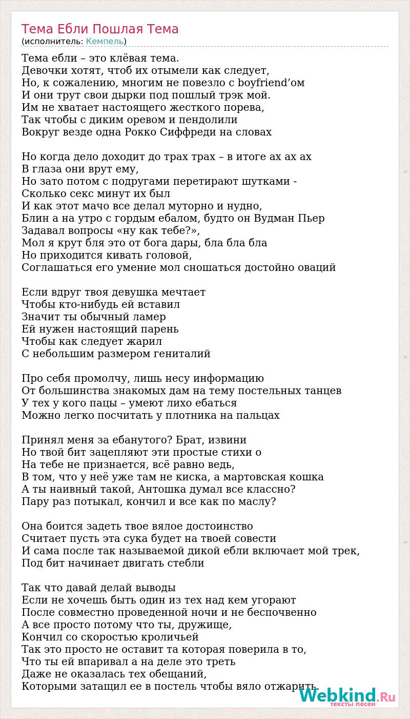 Тема ебли – это клёвая тема. Девочки хотят, чтоб их отымели как следует, Но, к сожалению, многим не повезло с boyfriend’ом И они трут свои дырки под пошлый трэк мой. Им не хватает настоящего жесткого порева, Так чтобы с диким оревом и пендолили Вокруг везде одна Рокко Сиффреди на словах Но когда дело доходит до трах трах – в итоге ах ах ах В глаза они врут ему, Но зато потом с подругами перетирают шутками - Сколько секс минут их был И как этот мачо все делал муторно и нудно, Блин а на утро с гордым ебалом, будто он Вудман Пьер Задавал вопросы «ну как тебе?», Мол я крут бля это от бога дары, бла бла бла Но приходится кивать головой, Соглашаться его умение мол сношаться достойно оваций Если вдруг твоя девушка мечтает Чтобы кто-нибудь ей вставил Значит ты обычный ламер Ей нужен настоящий парень Чтобы как следует жарил С небольшим размером гениталий Про себя промолчу, лишь несу информацию От большинства знакомых дам на тему постельных танцев У тех у кого пацы – умеют лихо ебаться Можно легко посчитать у плотника на пальцах Принял меня за ебанутого? Брат, извини Но твой бит зацепляют эти простые стихи о На тебе не признается, всё равно ведь, В том, что у неё уже там не киска, а мартовская кошка А ты наивный такой, Антошка думал все классно? Пару раз потыкал, кончил и все как по маслу? Она боится задеть твое вялое достоинство Считает пусть эта сука будет на твоей совести И сама после так называемой дикой ебли включает мой трек, Под бит начинает двигать стебли Так что давай делай выводы Если не хочешь быть один из тех над кем угорают После совместно проведенной ночи и не беспочвенно А все просто потому что ты, дружище, Кончил со скоростью кроличьей Так это просто не оставит та которая поверила в то, Что ты ей впаривал а на деле это треть Даже не оказалась тех обещаний, Которыми затащил ее в постель чтобы вяло отжарить.