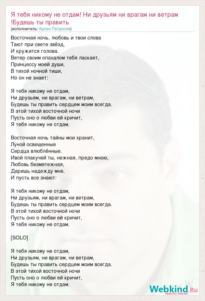 Восточная ночь, любовь и твои слова Тают при свете звёзд, И кружится голова. Ветер своим опахалом тебя ласкает, Принцессу моей души, В тихой ночной тиши, Но он не знает: Я тебя никому не отдам, Ни друзьям, ни врагам, ни ветрам, Будешь ты править сердцем моим всегда. В этой тихой восточной ночи Пусть оно о любви ей кричит, Я тебя никому не отдам. Восточная ночь тайны мои хранит, Луной освещенные Сердца влюблённые. Ивой плакучей ты, нежная, предо мною, Любовь безмятежная, Даришь надежду мне, И пусть все знают: Я тебя никому не отдам, Ни друзьям, ни врагам, ни ветрам, Будешь ты править сердцем моим всегда. В этой тихой восточной ночи Пусть оно о любви ей кричит, Я тебя никому не отдам. [SOLO] Я тебя никому не отдам, Ни друзьям, ни врагам, ни ветрам, Будешь ты править сердцем моим всегда. В этой тихой восточной ночи Пусть оно о любви ей кричит, Я тебя никому не отдам.