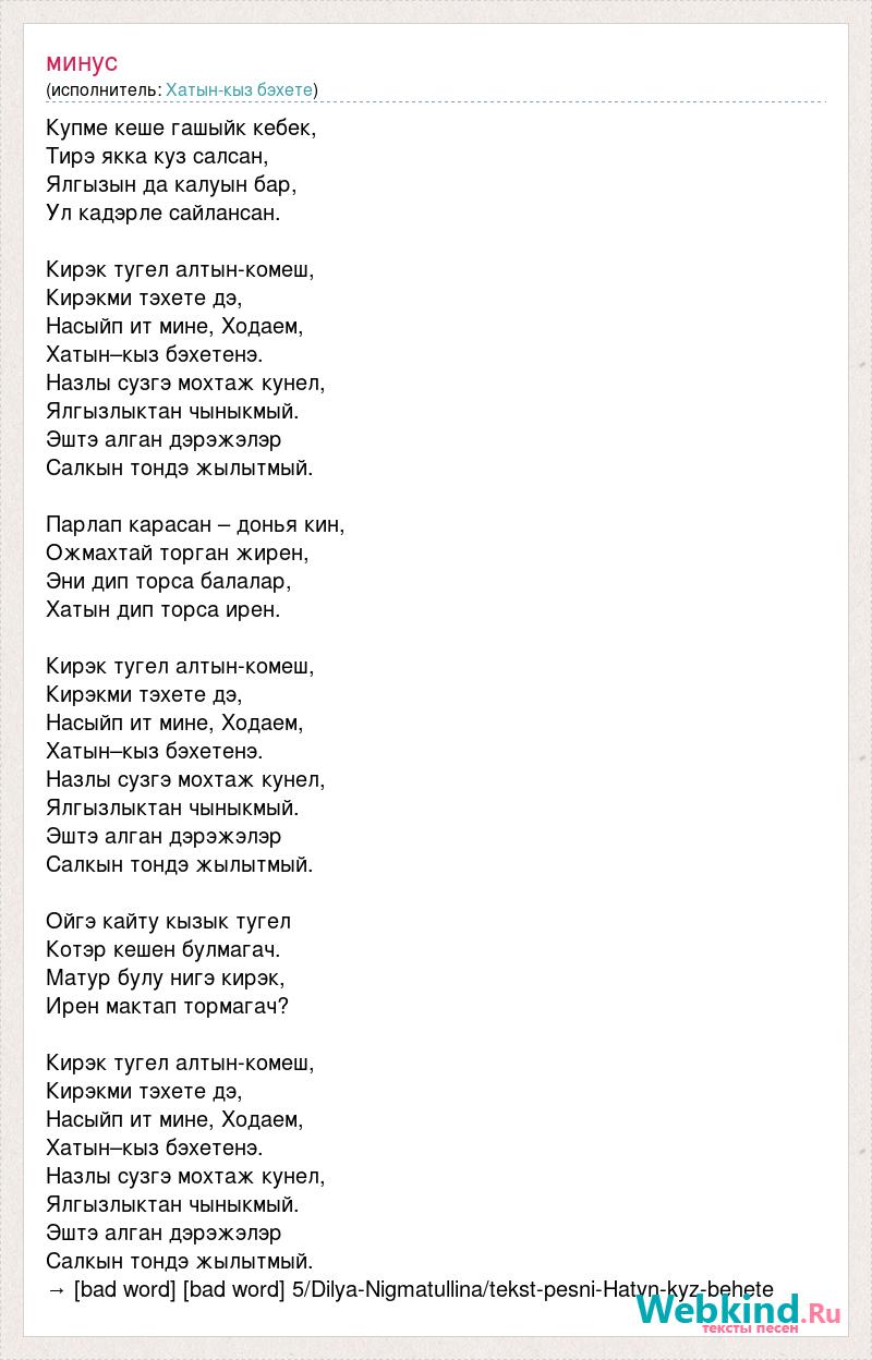 Купме кеше гашыйк кебек, Тирэ якка куз салсан, Ялгызын да калуын бар, Ул кадэрле сайлансан. Кирэк тугел алтын-комеш, Кирэкми тэхете дэ, Насыйп ит мине, Ходаем, Хатын–кыз бэхетенэ. Назлы сузгэ мохтаж кунел, Ялгызлыктан чыныкмый. Эштэ алган дэрэжэлэр Салкын тондэ жылытмый. Парлап карасан – донья кин, Ожмахтай торган жирен, Эни дип торса балалар, Хатын дип торса ирен. Кирэк тугел алтын-комеш, Кирэкми тэхете дэ, Насыйп ит мине, Ходаем, Хатын–кыз бэхетенэ. Назлы сузгэ мохтаж кунел, Ялгызлыктан чыныкмый. Эштэ алган дэрэжэлэр Салкын тондэ жылытмый. Ойгэ кайту кызык тугел Котэр кешен булмагач. Матур булу нигэ кирэк, Ирен мактап тормагач? Кирэк тугел алтын-комеш, Кирэкми тэхете дэ, Насыйп ит мине, Ходаем, Хатын–кыз бэхетенэ. Назлы сузгэ мохтаж кунел, Ялгызлыктан чыныкмый. Эштэ алган дэрэжэлэр Салкын тондэ жылытмый. → [bad word] [bad word] 5/Dilya-Nigmatullina/tekst-pesni-Hatyn-kyz-behete