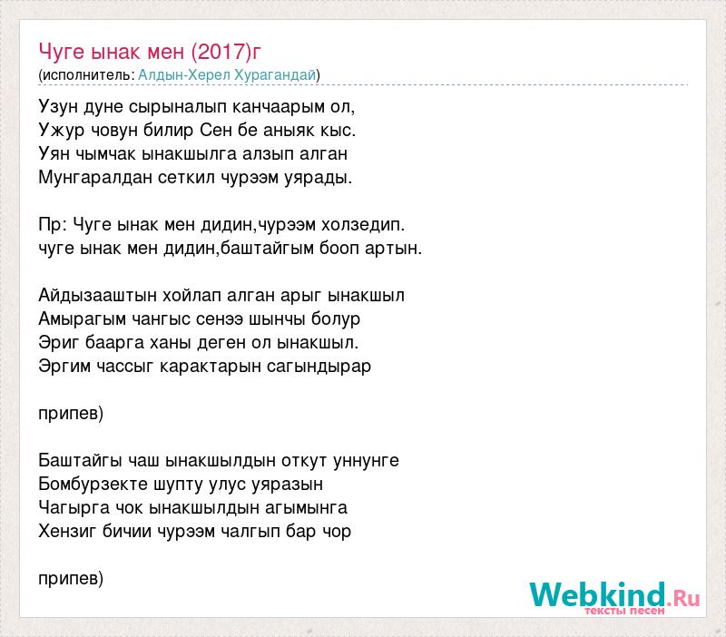 Узун дуне сырыналып канчаарым ол, Ужур човун билир Сен бе аныяк кыс. Уян чымчак ынакшылга алзып алган Мунгаралдан сеткил чурээм уярады. Пр: Чуге ынак мен дидин,чурээм холзедип. чуге ынак мен дидин,баштайгым бооп артын. Айдызааштын хойлап алган арыг ынакшыл Амырагым чангыс сенээ шынчы болур Эриг баарга ханы деген ол ынакшыл. Эргим чассыг карактарын сагындырар припев) Баштайгы чаш ынакшылдын откут уннунге Бомбурзекте шупту улус уяразын Чагырга чок ынакшылдын агымынга Хензиг бичии чурээм чалгып бар чор припев)