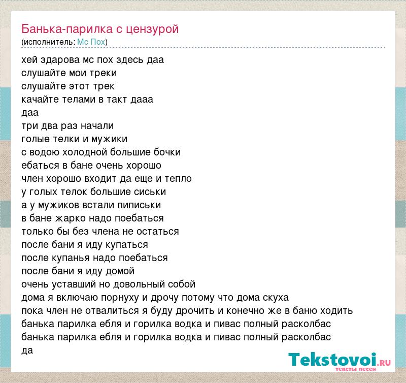 хей здарова мс пох здесь даа слушайте мои треки слушайте этот трек качайте телами в такт дааа даа три два раз начали голые телки и мужики с водою холодной большие бочки ебаться в бане очень хорошо член хорошо входит да еще и тепло у голых телок большие сиськи а у мужиков встали пиписьки в бане жарко надо поебаться только бы без члена не остаться после бани я иду купаться после купанья надо поебаться после бани я иду домой очень уставший но довольный собой дома я включаю порнуху и дрочу потому что дома скуха пока член не отвалиться я буду дрочить и конечно же в баню ходить банька парилка ебля и горилка водка и пивас полный расколбас банька парилка ебля и горилка водка и пивас полный расколбас да