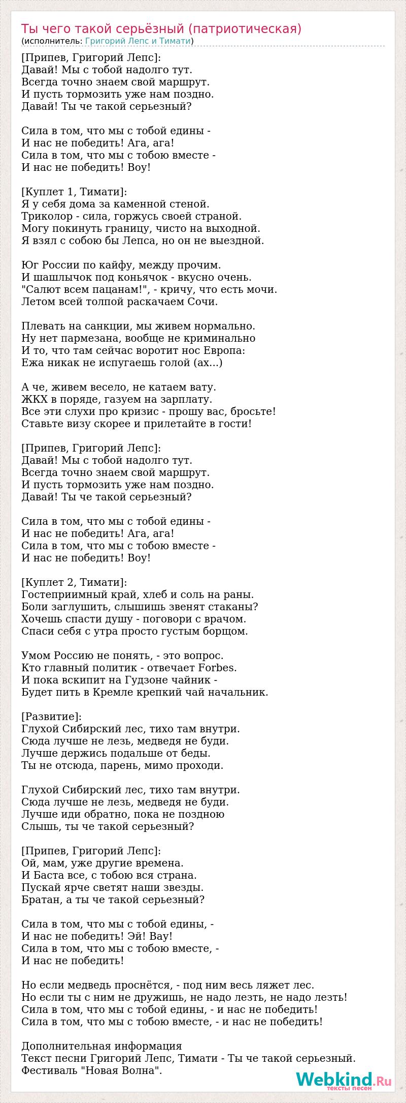 [Припев, Григорий Лепс]: Давай! Мы с тобой надолго тут. Всегда точно знаем свой маршрут. И пусть тормозить уже нам поздно. Давай! Ты че такой серьезный? Сила в том, что мы с тобой едины - И нас не победить! Ага, ага! Сила в том, что мы с тобою вместе - И нас не победить! Воу! [Куплет 1, Тимати]: Я у себя дома за каменной стеной. Триколор - сила, горжусь своей страной. Могу покинуть границу, чисто на выходной. Я взял с собою бы Лепса, но он не выездной. Юг России по кайфу, между прочим. И шашлычок под коньячок - вкусно очень. "Салют всем пацанам!", - кричу, что есть мочи. Летом всей толпой раскачаем Сочи. Плевать на санкции, мы живем нормально. Ну нет пармезана, вообще не криминально И то, что там сейчас воротит нос Европа: Ежа никак не испугаешь голой (ах...) А че, живем весело, не катаем вату. ЖКХ в поряде, газуем на зарплату. Все эти слухи про кризис - прошу вас, бросьте! Ставьте визу скорее и прилетайте в гости! [Припев, Григорий Лепс]: Давай! Мы с тобой надолго тут. Всегда точно знаем свой маршрут. И пусть тормозить уже нам поздно. Давай! Ты че такой серьезный? Сила в том, что мы с тобой едины - И нас не победить! Ага, ага! Сила в том, что мы с тобою вместе - И нас не победить! Воу! [Куплет 2, Тимати]: Гостеприимный край, хлеб и соль на раны. Боли заглушить, слышишь звенят стаканы? Хочешь спасти душу - поговори с врачом. Спаси себя с утра просто густым борщом. Умом Россию не понять, - это вопрос. Кто главный политик - отвечает Forbes. И пока вскипит на Гудзоне чайник - Будет пить в Кремле крепкий чай начальник. [Развитие]: Глухой Сибирский лес, тихо там внутри. Сюда лучше не лезь, медведя не буди. Лучше держись подальше от беды. Ты не отсюда, парень, мимо проходи. Глухой Сибирский лес, тихо там внутри. Сюда лучше не лезь, медведя не буди. Лучше иди обратно, пока не поздною Слышь, ты че такой серьезный? [Припев, Григорий Лепс]: Ой, мам, уже другие времена. И Баста все, с тобою вся страна. Пускай ярче светят наши звезды. Братан, а ты че такой серьезный? Сила в том, что мы с тобой едины, - И нас не победить! Эй! Вау! Сила в том, что мы с тобою вместе, - И нас не победить! Но если медведь проснётся, - под ним весь ляжет лес. Но если ты с ним не дружишь, не надо лезть, не надо лезть! Сила в том, что мы с тобой едины, - и нас не победить! Сила в том, что мы с тобою вместе, - и нас не победить! Дополнительная информация Текст песни Григорий Лепс, Тимати - Ты че такой серьезный. Фестиваль "Новая Волна".