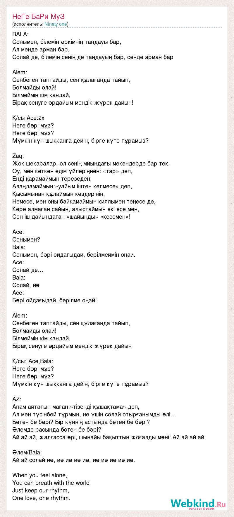 BALA: Сонымен, білемін əркімнің таңдауы бар, Ал менде арман бар, Солай де, білемін сенің де таңдауың бар, сенде арман бар Alem: Сенбеген таптайды, сен құлағанда тайып, Болмайды олай! Білмеймін кім қандай, Бірақ сенуге əрдайым мендік жүрек дайын! Қ/сы Асе:2x Неге бəрі мұз? Неге бəрі мұз? Мүмкін күн шыққанға дейін, бірге күте тұрамыз? Zaq: Жоқ шекаралар, ол сенің миыңдағы мекендерде бар тек. Оу, мен кеткен едім үйлеріңнен: «тар» деп, Енді қарамаймын терезеден, Алаңдамаймын:»уайым іштен келмесе» деп, Қысымынан құлаймын көздерінің, Немесе, мен оны байқамаймын қиялымен теңесе де, Көре алмаған сайын, алыстаймын екі есе мен, Сен іш дайындаған «шайыңды» «кесемен»! Асе: Сонымен? Bala: Сонымен, бəрі ойдағыдай, берілмеймін оңай. Асе: Солай де… Bala: Солай, иə Асе: Бəрі ойдағыдай, берілме оңай! Alem: Сенбеген таптайды, сен құлағанда тайып, Болмайды олай! Білмеймін кім қандай, Бірақ сенуге əрдайым мендік жүрек дайын Қ/сы: Асе,Bala: Неге бəрі мұз? Неге бəрі мұз? Мүмкін күн шыққанға дейін, бірге күте тұрамыз? AZ: Анам айтатын маған:»тізеңді құшақтама» деп, Ал мен түсінбей тұрмын, не үшін солай отырғанымды əлі… Бөтен бе бəрі? Бір күннің астында бөтен бе бəрі? Əлемде расында бөтен бе бəрі? Ай ай ай, жалғасса əрі, шынайы бақыттың жоғалды мəні! Ай ай ай ай Əлем/Bala: Ай ай солай иə, иə иə иə иə, иə иə иə иə иə. When you feel alone, You can breath with the world Just keep our rhythm, One love, one rhythm.