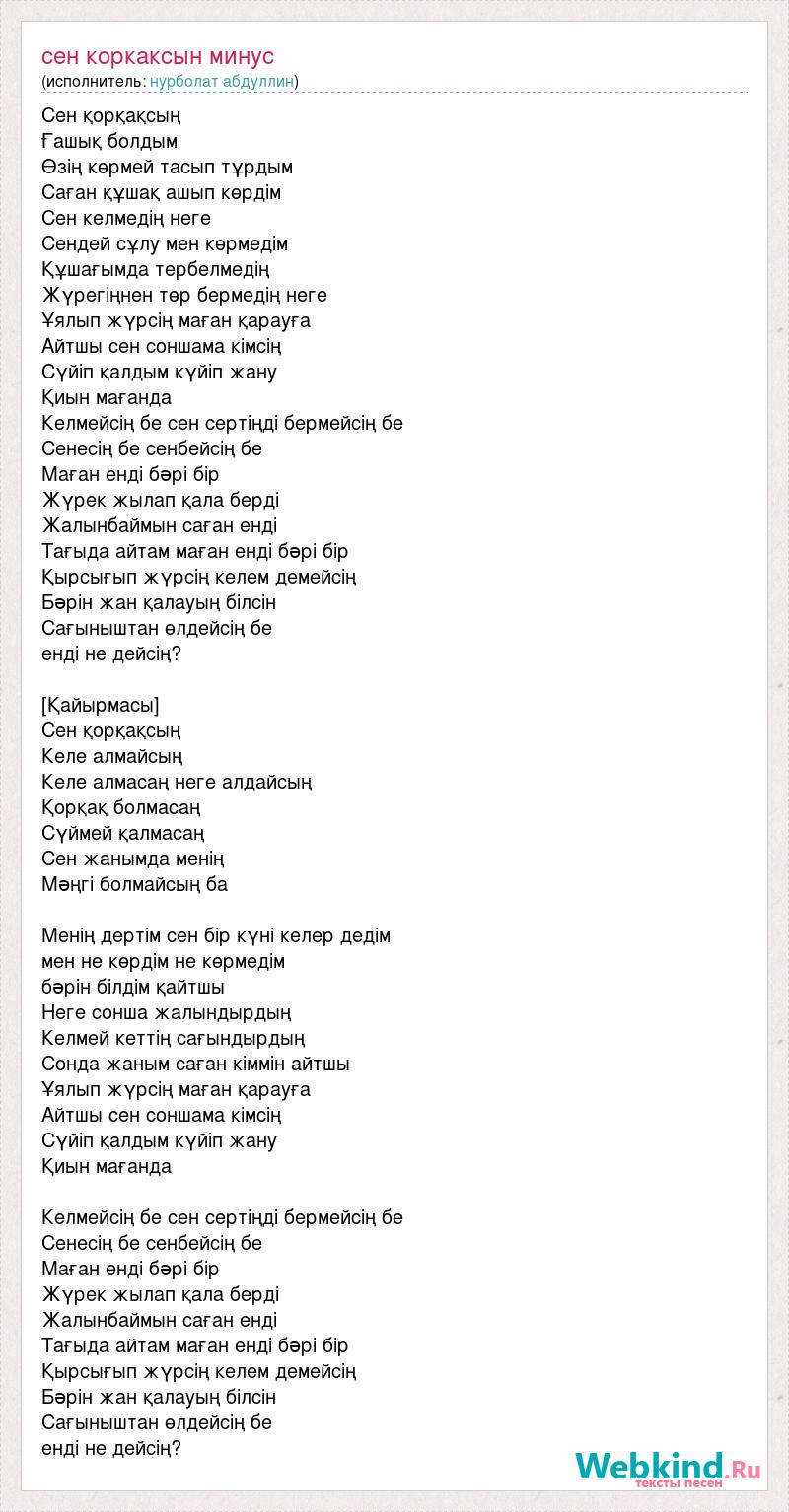 Сен қорқақсың Ғашық болдым Өзің көрмей тасып тұрдым Саған құшақ ашып көрдім Сен келмедің неге Сендей сұлу мен көрмедім Құшағымда тербелмедің Жүрегіңнен төр бермедің неге Ұялып жүрсің маған қарауға Айтшы сен соншама кімсің Сүйіп қалдым күйіп жану Қиын мағанда Келмейсің бе сен сертіңді бермейсің бе Сенесің бе сенбейсің бе Маған енді бəрі бір Жүрек жылап қала берді Жалынбаймын саған енді Тағыда айтам маған енді бəрі бір Қырсығып жүрсің келем демейсің Бəрін жан қалауың білсін Сағыныштан өлдейсің бе енді не дейсің? [Қайырмасы] Сен қорқақсың Келе алмайсың Келе алмасаң неге алдайсың Қорқақ болмасаң Сүймей қалмасаң Сен жанымда менің Мəңгі болмайсың ба Менің дертім сен бір күні келер дедім мен не көрдім не көрмедім бəрін білдім қайтшы Неге сонша жалындырдың Келмей кеттің сағындырдың Сонда жаным саған кіммін айтшы Ұялып жүрсің маған қарауға Айтшы сен соншама кімсің Сүйіп қалдым күйіп жану Қиын мағанда Келмейсің бе сен сертіңді бермейсің бе Сенесің бе сенбейсің бе Маған енді бəрі бір Жүрек жылап қала берді Жалынбаймын саған енді Тағыда айтам маған енді бəрі бір Қырсығып жүрсің келем демейсің Бəрін жан қалауың білсін Сағыныштан өлдейсің бе енді не дейсің?