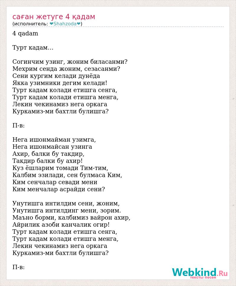 4 qadam Турт кадам… Согинчим узинг, жоним биласанми? Мехрим сенда жоним, сезасанми? Сени кургим келади дунёда Якка узимники дегим келади! Турт кадам колади етишга сенга, Турт кадам колади етишга менга, Лекин чекинамиз нега оркага Куркамиз-ми бахтли булишга? П-в: Нега ишонмайман узимга, Нега ишонмайсан узинга Ахир, балки бу такдир, Такдир балки бу ахир! Куз ёшларим томади Тим-тим, Калбим эзилади, сен булмаса Ким, Ким сенчалар севади мени Ким менчалар асрайди сени? Унутишга интилдим сени, жоним, Унутишга интилдинг мени, зорим. Маъно борми, калбимиз вайрон ахир, Айрилик азоби канчалик огир! Турт кадам колади етишга сенга, Турт кадам колади етишга менга, Лекин чекинамиз нега оркага Куркамиз-ми бахтли булишга? П-в:
