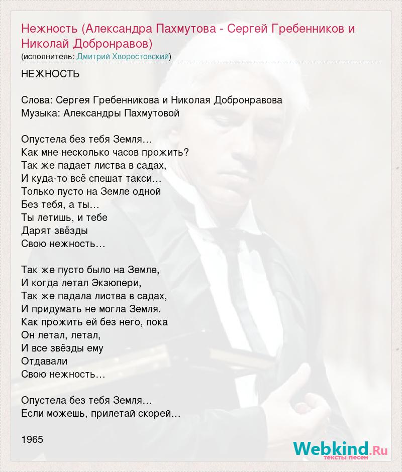 НЕЖНОСТЬ Слова: Сергея Гребенникова и Николая Добронравова Музыка: Александры Пахмутовой Опустела без тебя Земля… Как мне несколько часов прожить? Так же падает листва в садах, И куда-то всё спешат такси… Только пусто на Земле одной Без тебя, а ты… Ты летишь, и тебе Дарят звёзды Свою нежность… Так же пусто было на Земле, И когда летал Экзюпери, Так же падала листва в садах, И придумать не могла Земля. Как прожить ей без него, пока Он летал, летал, И все звёзды ему Отдавали Свою нежность… Опустела без тебя Земля… Если можешь, прилетай скорей… 1965