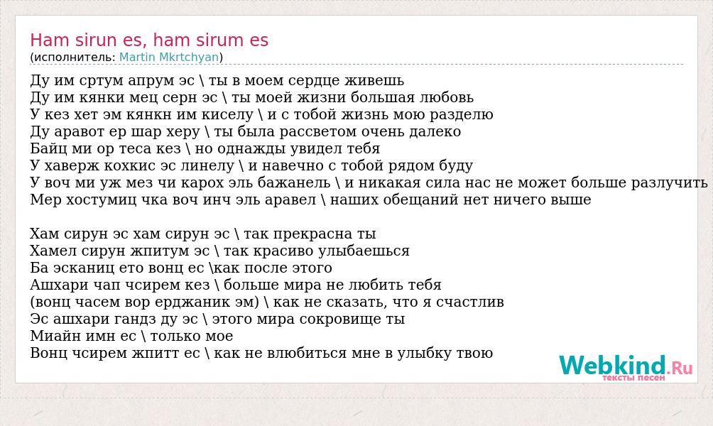 Ду им сртум апрум эс \ ты в моем сердце живешь Ду им кянки мец серн эс \ ты моей жизни большая любовь У кез хет эм кянкн им киселу \ и с тобой жизнь мою разделю Ду аравот ер шар херу \ ты была рассветом очень далеко Байц ми ор теса кез \ но однажды увидел тебя У хаверж кохкис эс линелу \ и навечно с тобой рядом буду У воч ми уж мез чи карох эль бажанель \ и никакая сила нас не может больше разлучить Мер хостумиц чка воч инч эль аравел \ наших обещаний нет ничего выше Хам сирун эс хам сирун эс \ так прекрасна ты Хамел сирун жпитум эс \ так красиво улыбаешься Ба эсканиц ето вонц ес \как после этого Ашхари чап чсирем кез \ больше мира не любить тебя (вонц часем вор ерджаник эм) \ как не сказать, что я счастлив Эс ашхари гандз ду эс \ этого мира сокровище ты Миайн имн ес \ только мое Вонц чсирем жпитт ес \ как не влюбиться мне в улыбку твою