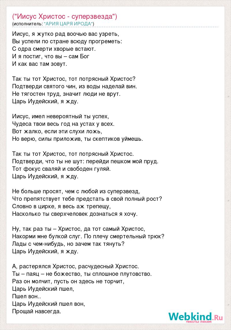 Иисус, я жутко рад воочью вас узреть, Вы успели по стране всюду прогреметь: С одра смерти хворые встают. И я постиг, что вы – сам Бог И как вас там зовут. Так ты тот Христос, тот потрясный Христос? Подтверди святого чин, из воды наделай вин. Не тягостен труд, значит люди не врут. Царь Иудейский, я жду. Иисус, имел невероятный ты успех, Чудеса твои весь год на устах у всех. Вот жалко, если эти слухи ложь, Но верю, силы приложив, ты скептиков уймешь. Так ты тот Христос, тот потрясный Христос. Подтверди, что ты не шут: перейди пешком мой пруд. Тот фокус сваляй и свободен гуляй. Царь Иудейский, я жду. Не больше просят, чем с любой из суперзвезд, Что препятствует тебе предстать в свой полный рост? Словно в цирке, я весь аж трепещу, Насколько ты сверхчеловек дознаться я хочу. Ну, так раз ты – Христос, да тот самый Христос, Накорми мне булкой слуг. По плечу смертельный трюк? Лады с чем-нибудь, но зачем так тянуть? Царь Иудейский, я жду. А, растерялся Христос, расчудесный Христос. Ты – паяц – не божество, ты сплошное плутовство. Раз он молчит, пусть он здесь не торчит, Царь Иудейский пшел, Пшел вон.. Царь Иудейский пшел вон, Прощай навсегда.