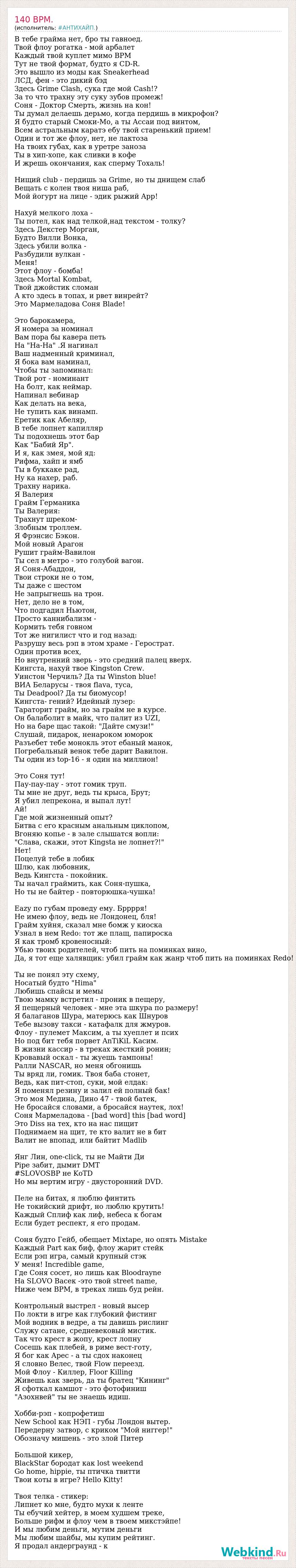 В тебе грайма нет, бро ты гавноед. Твой флоу рогатка - мой арбалет Каждый твой куплет мимо BPM Тут не твой формат, будто я CD-R. Это вышло из моды как Sneakerhead ЛСД, фен - это дикий бэд Здесь Grime Clash, сука где мой Cash!? За то что трахну эту суку зубов промеж! Соня - Доктор Смерть, жизнь на кон! Ты думал делаешь дерьмо, когда пердишь в микрофон? Я будто старый Смоки-Мо, а ты Ассаи под винтом, Всем астральным каратэ ебу твой старенький прием! Один и тот же флоу, нет, не лактоза На твоих губах, как в уретре заноза Ты в хип-хопе, как сливки в кофе И жрешь окончания, как сперму Тохаль! Нищий club - пердишь за Grime, но ты днищем слаб Вещать с колен твоя ниша раб, Мой йогурт на лице - эдик рыжий App! Нахуй мелкого лоха - Ты потел, как над телкой,над текстом - толку? Здесь Декстер Морган, Будто Вилли Вонка, Здесь убили волка - Разбудили вулкан - Меня! Этот флоу - бомба! Здесь Mortal Kombat, Твой джойстик сломан А кто здесь в топах, и рвет винрейт? Это Мармеладова Соня Blade! Это барокамера, Я номера за номинал Вам пора бы кавера петь На "На-На" .Я нагинал Ваш надменный криминал, Я бока вам наминал, Чтобы ты запоминал: Твой рот - номинант На болт, как неймар. Напинал вебинар Как делать на века, Не тупить как винамп. Еретик как Абеляр, В тебе лопнет капилляр Ты подохнешь этот бар Как "Бабий Яр". И я, как змея, мой яд: Рифма, хайп и ямб Ты в буккаке рад, Ну ка нахер, раб. Трахну нарика. Я Валерия Грайм Германика Ты Валерия: Трахнут шреком- Злобным троллем. Я Фрэнсис Бэкон. Мой новый Арагон Рушит грайм-Вавилон Ты сел в метро - это голубой вагон. Я Соня-Абаддон, Твои строки не о том, Ты даже с шестом Не запрыгнешь на трон. Нет, дело не в том, Что подгадил Ньютон, Просто каннибализм - Кормить тебя говном Тот же нигилист что и год назад: Разрушу весь рэп в этом храме - Герострат. Один против всех, Но внутренний зверь - это средний палец вверх. Кингста, нахуй твое Kingston Crew. Уинстон Черчиль? Да ты Winston blue! ВИА Беларусы - твоя flava, туса, Ты Deadpool? Да ты биомусор! Кингста- гений? Идейный лузер: Тараторит грайм, но за грайм не в курсе. Он балаболит в майк, что палит из UZI, Но на баре щас такой: "Дайте смузи!" Слушай, пидарок, ненароком юморок Разъебет тебе монокль этот ебаный манок, Погребальный венок тебе дарит Вавилон. Ты один из top-16 - я один на миллион! Это Соня тут! Пау-пау-пау - этот гомик труп. Ты мне не друг, ведь ты крыса, Брут; Я убил лепрекона, и выпал лут! Ай! Где мой жизненный опыт? Битва с его красным анальным циклопом, Вгоняю копье - в зале слышатся вопли: "Слава, скажи, этот Kingsta не лопнет?!" Нет! Поцелуй тебе в лобик Шлю, как любовник, Ведь Кингста - покойник. Ты начал граймить, как Соня-пушка, Но ты не байтер - повторюшка-чушка! Eazy по губам проведу ему. Брррря! Не имею флоу, ведь не Лондонец, бля! Грайм хуйня, сказал мне бомж у киоска Узнал в нем Redo: тот же плащ, папироска Я как тромб кровеносный: Убью твоих родителей, чтоб пить на поминках вино, Да, я тот еще халявщик: убил грайм как жанр чтоб пить на поминках Redo! Ты не понял эту схему, Носатый будто "Hima" Любишь спайсы и мемы Твою мамку встретил - проник в пещеру, Я пещерный человек - мне эта шкура по размеру! Я балаганов Шура, матерюсь как Шнуров Тебе вызову такси - катафалк для жмуров. Флоу - пулемет Максим, а ты хуеплет и псих Но под бит тебя порвет AnTiKiL Касим. В жизни кассир - в треках жесткий ронин; Кровавый оскал - ты жуешь тампоны! Ралли NASCAR, но меня обгонишь Ты вряд ли, гомик. Твоя баба стонет, Ведь, как пит-стоп, 
