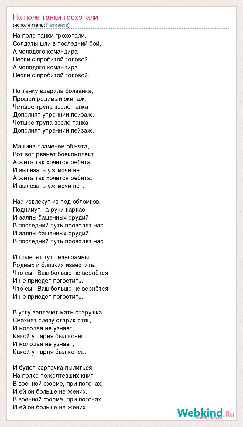 На поле танки грохотали, Солдаты шли в последний бой, А молодого командира Несли с пробитой головой. А молодого командира Несли с пробитой головой. По танку вдарила болванка, Прощай родимый экипаж. Четыре трупа возле танка Дополнят утренний пейзаж. Четыре трупа возле танка Дополнят утренний пейзаж. Машина пламенем объята, Вот вот рванёт боекомплект А жить так хочется ребята. И вылезать уж мочи нет. А жить так хочется ребята. И вылезать уж мочи нет. Нас извлекут из под обломков, Поднимут на руки каркас И залпы башенных орудий В последний путь проводят нас. И залпы башенных орудий В последний путь проводят нас. И полетят тут телеграммы Родных и близких известить, Что сын Ваш больше не вернётся И не приедет погостить. Что сын Ваш больше не вернётся И не приедет погостить. В углу заплачет мать старушка Смахнет слезу старик отец. И молодая не узнает, Какой у парня был конец. И молодая не узнает, Какой у парня был конец. И будет карточка пылиться На полке пожелтевших книг. В военной форме, при погонах, И ей он больше не жених. В военной форме, при погонах, И ей он больше не жених.