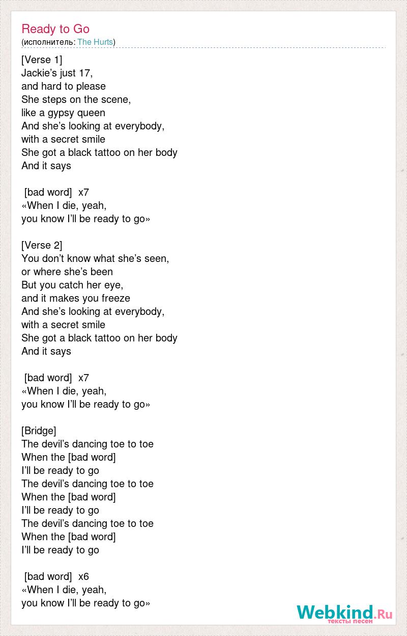 [Verse 1] Jackie’s just 17, and hard to please She steps on the scene, like a gypsy queen And she’s looking at everybody, with a secret smile She got a black tattoo on her body And it says [bad word] x7 «When I die, yeah, you know I’ll be ready to go» [Verse 2] You don’t know what she’s seen, or where she’s been But you catch her eye, and it makes you freeze And she’s looking at everybody, with a secret smile She got a black tattoo on her body And it says [bad word] x7 «When I die, yeah, you know I’ll be ready to go» [Bridge] The devil’s dancing toe to toe When the [bad word] I’ll be ready to go The devil’s dancing toe to toe When the [bad word] I’ll be ready to go The devil’s dancing toe to toe When the [bad word] I’ll be ready to go [bad word] x6 «When I die, yeah, you know I’ll be ready to go»