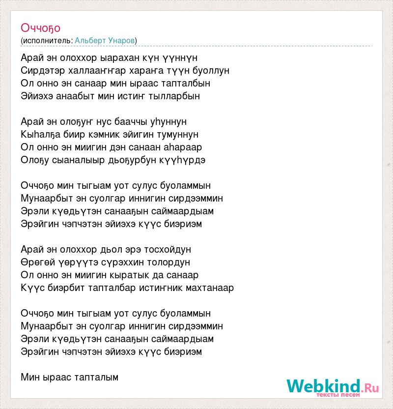 Арай эн олоххор ыарахан күн үүннүн Сирдэтэр халлааҥҥар хараҥа түүн буоллун Ол онно эн санаар мин ыраас тапталбын Эйиэхэ анаабыт мин истиҥ тылларбын Арай эн олоҕуҥ нус бааччы уhуннун Кыhалҕа биир кэмник эйигин тумуннун Ол онно эн миигин дэн санаан аhараар Олоҕу сыаналыыр дьоҕурбун күүhүрдэ Оччоҕо мин тыгыам уот сулус буоламмын Мунаарбыт эн суолгар иннигин сирдээммин Эрэли күөдьүтэн санааҕын саймаардыам Эрэйгин чэпчэтэн эйиэхэ күүс биэриэм Арай эн олоххор дьол эрэ тосхойдун Өрөгөй үөрүүтэ сүрэххин толордун Ол онно эн миигин кыратык да санаар Күүс биэрбит тапталбар истиҥник махтанаар Оччоҕо мин тыгыам уот сулус буоламмын Мунаарбыт эн суолгар иннигин сирдээммин Эрэли күөдьүтэн санааҕын саймаардыам Эрэйгин чэпчэтэн эйиэхэ күүс биэриэм Мин ыраас тапталым