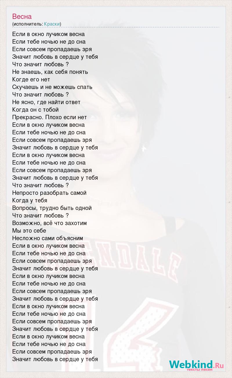 Если в окно лучиком весна Если тебе ночью не до сна Если совсем пропадаешь зря Значит любовь в сердце у тебя Что значит любовь ? Не знаешь, как себя понять Когде его нет Скучаешь и не можешь спать Что значит любовь ? Не ясно, где найти ответ Когда он с тобой Прекрасно. Плохо если нет Если в окно лучиком весна Если тебе ночью не до сна Если совсем пропадаешь зря Значит любовь в сердце у тебя Если в окно лучиком весна Если тебе ночью не до сна Если совсем пропадаешь зря Значит любовь в сердце у тебя Что значит любовь ? Непросто разобрать самой Когда у тебя Вопросы, трудно быть одной Что значит любовь ? Возможно, всё что захотим Мы это себе Несложно сами объясним Если в окно лучиком весна Если тебе ночью не до сна Если совсем пропадаешь зря Значит любовь в сердце у тебя Если в окно лучиком весна Если тебе ночью не до сна Если совсем пропадаешь зря Значит любовь в сердце у тебя Если в окно лучиком весна Если тебе ночью не до сна Если совсем пропадаешь зря Значит любовь в сердце у тебя Если в окно лучиком весна Если тебе ночью не до сна Если совсем пропадаешь зря Значит любовь в сердце у тебя