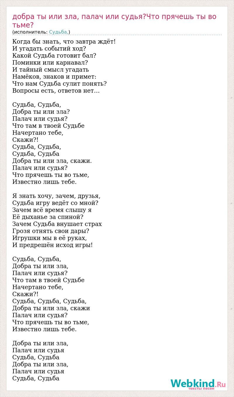 Когда бы знать, что завтра ждёт! И угадать событий ход? Какой Судьба готовит бал? Поминки или карнавал? И тайный смысл угадать Намёков, знаков и примет: Что нам Судьба сулит понять? Вопросы есть, ответов нет… Судьба, Судьба, Добра ты или зла? Палач или судья? Что там в твоей Судьбе Начертано тебе, Скажи?! Судьба, Судьба, Судьба, Судьба Добра ты или зла, скажи. Палач или судья? Что прячешь ты во тьме, Известно лишь тебе. Я знать хочу, зачем, друзья, Судьба игру ведёт со мной? Зачем всё время слышу я Её дыханье за спиной? Зачем Судьба внушает страх Грозя отнять свои дары? Игрушки мы в её руках, И предрешён исход игры! Судьба, Судьба, Добра ты или зла, Палач или судья? Что там в твоей Судьбе Начертано тебе, Скажи?! Судьба, Судьба, Судьба, Добра ты или зла, скажи Палач или судья? Что прячешь ты во тьме, Известно лишь тебе. Добра ты или зла, Палач или судья Судьба, Судьба Добра ты или зла, Палач или судья Судьба, Судьба