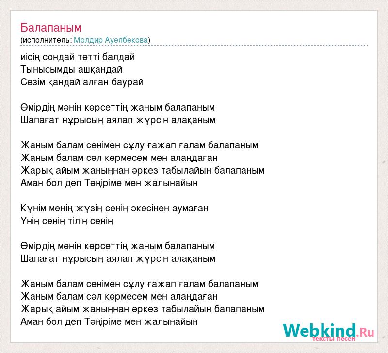 иісің сондай тәтті балдай Тынысымды ашқандай Сезім қандай алған баурай Өмірдің мәнін көрсеттің жаным балапаным Шапағат нұрысың аялап жүрсін алақаным Жаным балам сенімен сұлу ғажап ғалам балапаным Жаным балам сәл көрмесем мен алаңдаған Жарық айым жаныңнан әркез табылайын балапаным Аман бол деп Тәңіріме мен жалынайын Күнім менің жүзің сенің әкесінен аумаған Үнің сенің тілің сенің Өмірдің мәнін көрсеттің жаным балапаным Шапағат нұрысың аялап жүрсін алақаным Жаным балам сенімен сұлу ғажап ғалам балапаным Жаным балам сәл көрмесем мен алаңдаған Жарық айым жаныңнан әркез табылайын балапаным Аман бол деп Тәңіріме мен жалынайын