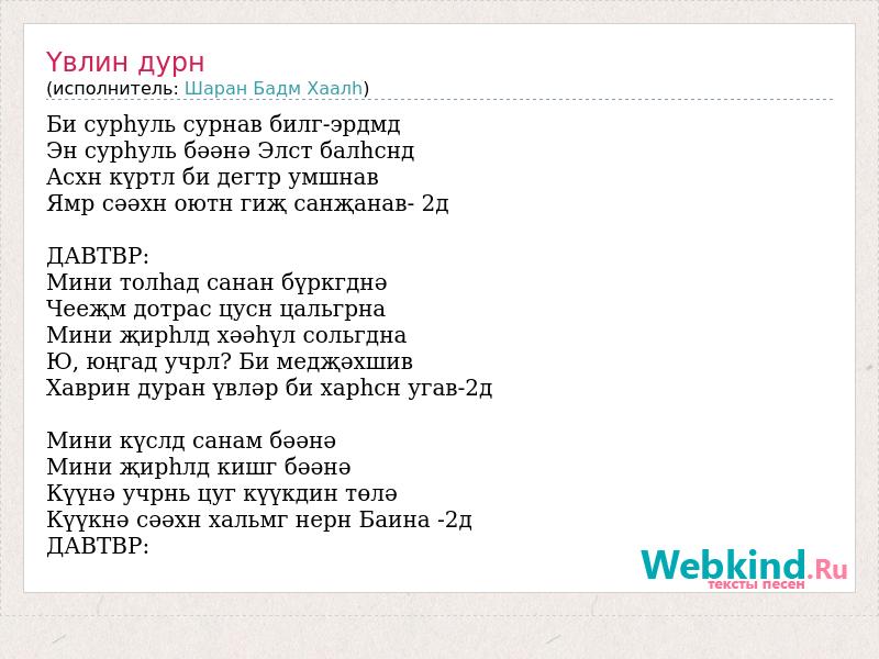 Би сурһуль сурнав билг-эрдмд Эн сурһуль бәәнә Элст балһснд Асхн күртл би дегтр умшнав Ямр сәәхн оютн гиҗ санҗанав- 2д ДАВТВР: Мини толһад санан бүркгднә Чееҗм дотрас цусн цальгрна Мини җирһлд хәәһүл сольгдна Ю, юңгад учрл? Би медҗәхшив Хаврин дуран үвләр би харһсн угав-2д Мини күслд санам бәәнә Мини җирһлд кишг бәәнә Күүнә учрнь цуг күүкдин төлә Күүкнә сәәхн хальмг нерн Баина -2д ДАВТВР: