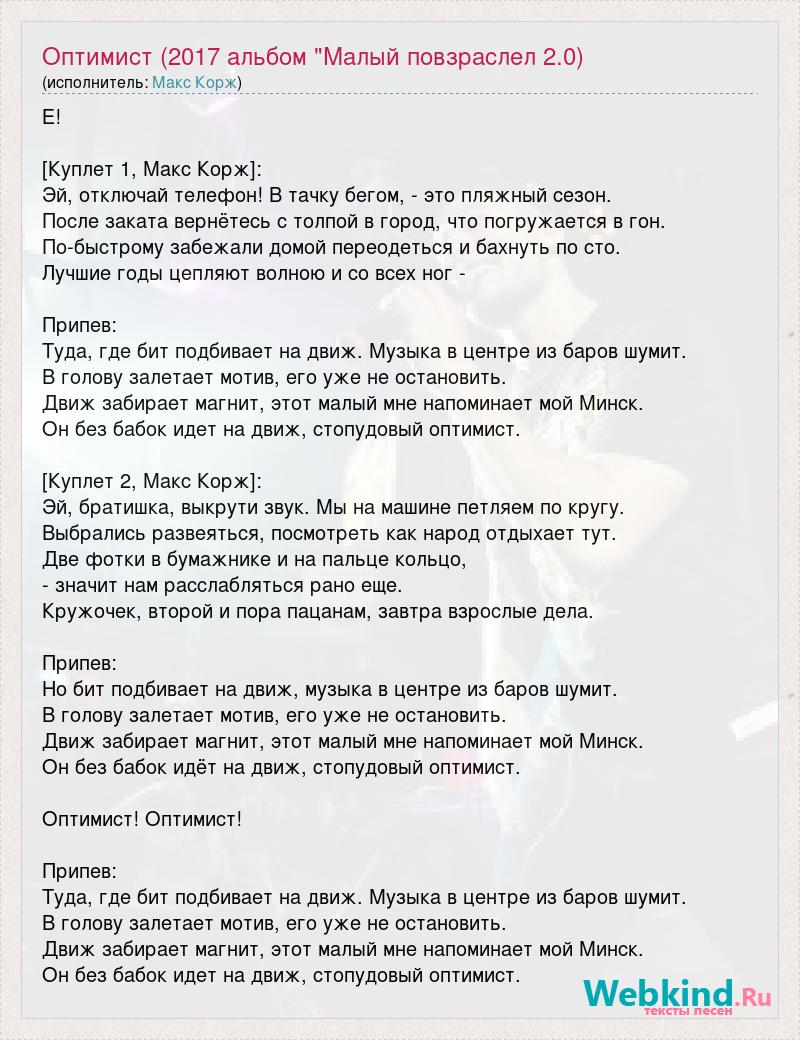 Е! [Куплет 1, Макс Корж]: Эй, отключай телефон! В тачку бегом, - это пляжный сезон. После заката вернётесь с толпой в город, что погружается в гон. По-быстрому забежали домой переодеться и бахнуть по сто. Лучшие годы цепляют волною и со всех ног - Припев: Туда, где бит подбивает на движ. Музыка в центре из баров шумит. В голову залетает мотив, его уже не остановить. Движ забирает магнит, этот малый мне напоминает мой Минск. Он без бабок идет на движ, стопудовый оптимист. [Куплет 2, Макс Корж]: Эй, братишка, выкрути звук. Мы на машине петляем по кругу. Выбрались развеяться, посмотреть как народ отдыхает тут. Две фотки в бумажнике и на пальце кольцо, - значит нам расслабляться рано еще. Кружочек, второй и пора пацанам, завтра взрослые дела. Припев: Но бит подбивает на движ, музыка в центре из баров шумит. В голову залетает мотив, его уже не остановить. Движ забирает магнит, этот малый мне напоминает мой Минск. Он без бабок идёт на движ, стопудовый оптимист. Оптимист! Оптимист! Припев: Туда, где бит подбивает на движ. Музыка в центре из баров шумит. В голову залетает мотив, его уже не остановить. Движ забирает магнит, этот малый мне напоминает мой Минск. Он без бабок идет на движ, стопудовый оптимист.