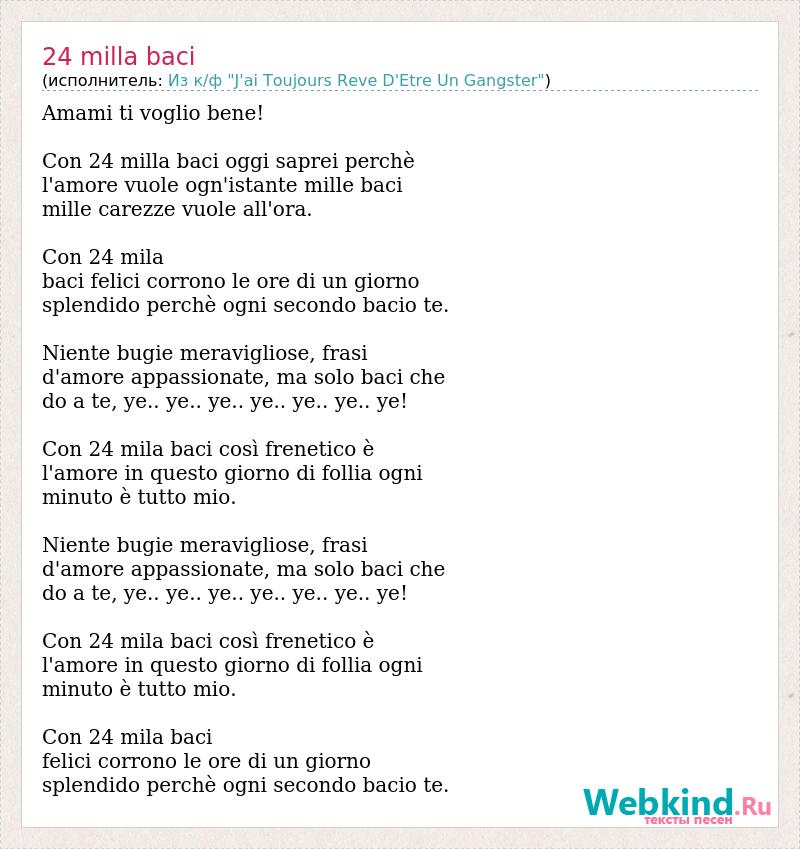 Amami ti voglio bene! Con 24 milla baci oggi saprei perchè l'amore vuole ogn'istante mille baci mille carezze vuole all'ora. Con 24 mila baci felici corrono le ore di un giorno splendido perchè ogni secondo bacio te. Niente bugie meravigliose, frasi d'amore appassionate, ma solo baci che do a te, ye.. ye.. ye.. ye.. ye.. ye.. ye! Con 24 mila baci così frenetico è l'amore in questo giorno di follia ogni minuto è tutto mio. Niente bugie meravigliose, frasi d'amore appassionate, ma solo baci che do a te, ye.. ye.. ye.. ye.. ye.. ye.. ye! Con 24 mila baci così frenetico è l'amore in questo giorno di follia ogni minuto è tutto mio. Con 24 mila baci felici corrono le ore di un giorno splendido perchè ogni secondo bacio te.