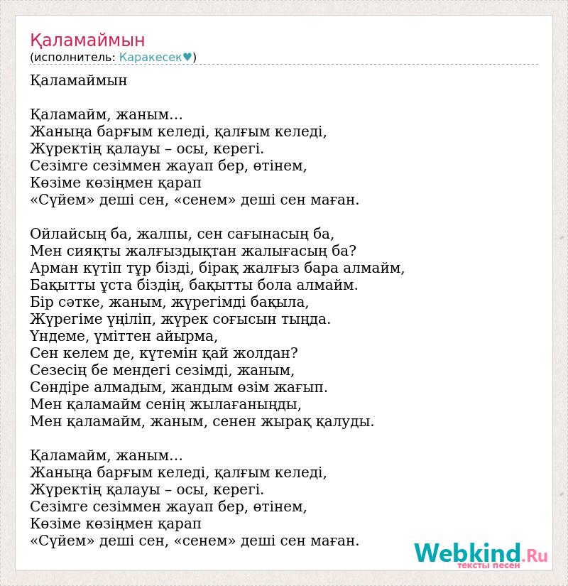 Қаламаймын Қаламайм, жаным… Жаныңа барғым келеді, қалғым келеді, Жүректің қалауы – осы, керегі. Сезімге сезіммен жауап бер, өтінем, Көзіме көзіңмен қарап «Сүйем» деші сен, «сенем» деші сен маған. Ойлайсың ба, жалпы, сен сағынасың ба, Мен сияқты жалғыздықтан жалығасың ба? Арман күтіп тұр бізді, бірақ жалғыз бара алмайм, Бақытты ұста біздің, бақытты бола алмайм. Бір сәтке, жаным, жүрегімді бақыла, Жүрегіме үңіліп, жүрек соғысын тыңда. Үндеме, үміттен айырма, Сен келем де, күтемін қай жолдан? Сезесің бе мендегі сезімді, жаным, Сөндіре алмадым, жандым өзім жағып. Мен қаламайм сенің жылағаныңды, Мен қаламайм, жаным, сенен жырақ қалуды. Қаламайм, жаным… Жаныңа барғым келеді, қалғым келеді, Жүректің қалауы – осы, керегі. Сезімге сезіммен жауап бер, өтінем, Көзіме көзіңмен қарап «Сүйем» деші сен, «сенем» деші сен маған.