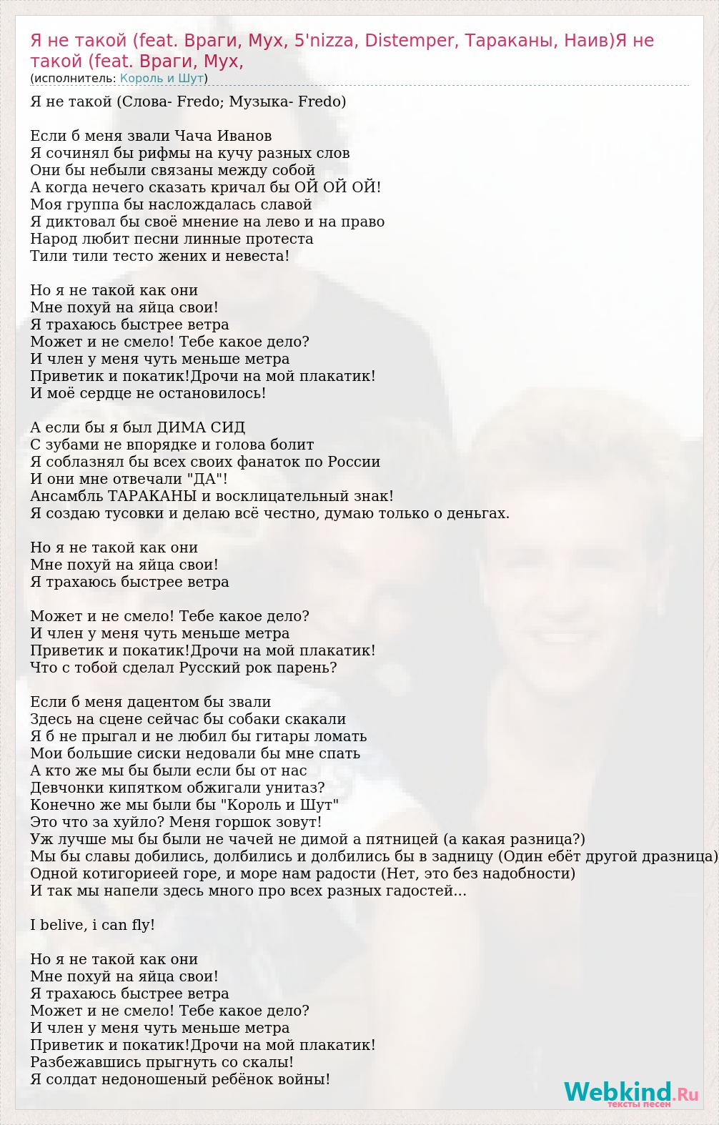 Я не такой (Слова- Fredo; Музыка- Fredo) Если б меня звали Чача Иванов Я сочинял бы рифмы на кучу разных слов Они бы небыли связаны между собой А когда нечего сказать кричал бы ОЙ ОЙ ОЙ! Моя группа бы наслождалась славой Я диктовал бы своё мнение на лево и на право Народ любит песни линные протеста Тили тили тесто жених и невеста! Но я не такой как они Мне похуй на яйца свои! Я трахаюсь быстрее ветра Может и не смело! Тебе какое дело? И член у меня чуть меньше метра Приветик и покатик!Дрочи на мой плакатик! И моё сердце не остановилось! А если бы я был ДИМА СИД С зубами не впорядке и голова болит Я соблазнял бы всех своих фанаток по России И они мне отвечали "ДА"! Ансамбль ТАРАКАНЫ и восклицательный знак! Я создаю тусовки и делаю всё честно, думаю только о деньгах. Но я не такой как они Мне похуй на яйца свои! Я трахаюсь быстрее ветра Может и не смело! Тебе какое дело? И член у меня чуть меньше метра Приветик и покатик!Дрочи на мой плакатик! Что с тобой сделал Русский рок парень? Если б меня дацентом бы звали Здесь на сцене сейчас бы собаки скакали Я б не прыгал и не любил бы гитары ломать Мои большие сиски недовали бы мне спать А кто же мы бы были если бы от нас Девчонки кипятком обжигали унитаз? Конечно же мы были бы "Король и Шут" Это что за хуйло? Меня горшок зовут! Уж лучше мы бы были не чачей не димой а пятницей (а какая разница?) Мы бы славы добились, долбились и долбились бы в задницу (Один ебёт другой дразница) Одной котигориеей горе, и море нам радости (Нет, это без надобности) И так мы напели здесь много про всех разных гадостей... I belive, i can fly! Но я не такой как они Мне похуй на яйца свои! Я трахаюсь быстрее ветра Может и не смело! Тебе какое дело? И член у меня чуть меньше метра Приветик и покатик!Дрочи на мой плакатик! Разбежавшись прыгнуть со скалы! Я солдат недоношеный ребёнок войны!