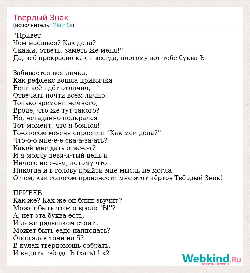 ''Привет! Чем маешься? Как дела? Скажи, ответь, заметь же меня!'' Да, всё прекрасно как и всегда, поэтому вот тебе буква Ъ Забивается вся личка, Как рефлекс вошла привычка Если всё идёт отлично, Отвечать почти всем лично. Только времени немного, Вроде, что же тут такого? Но, негаданно подкрался Тот момент, что я боялся! Го-олосом ме-еня спросили ''Как мои дела?'' Что-о-о мне-е-е ска-а-за-ать? Какой мне дать отве-е-т? И я молчу девя-я-тый день и Ничего не е-е-м, потому что Никогда и в голову прийти мне мысль не могла О том, как голосом произнести мне этот чёртов Твёрдый Знак! ПРИВЕВ Как же? Как же он блин звучит? Может быть что-то вроде ''Ы''? А, нет эта буква есть, И даже рядышком стоит... Может быть еадо напподать? Опор эдак тонн на 5? В кулак твердомощь собрать, И выдать твёрдо Ъ (хать) ! х2