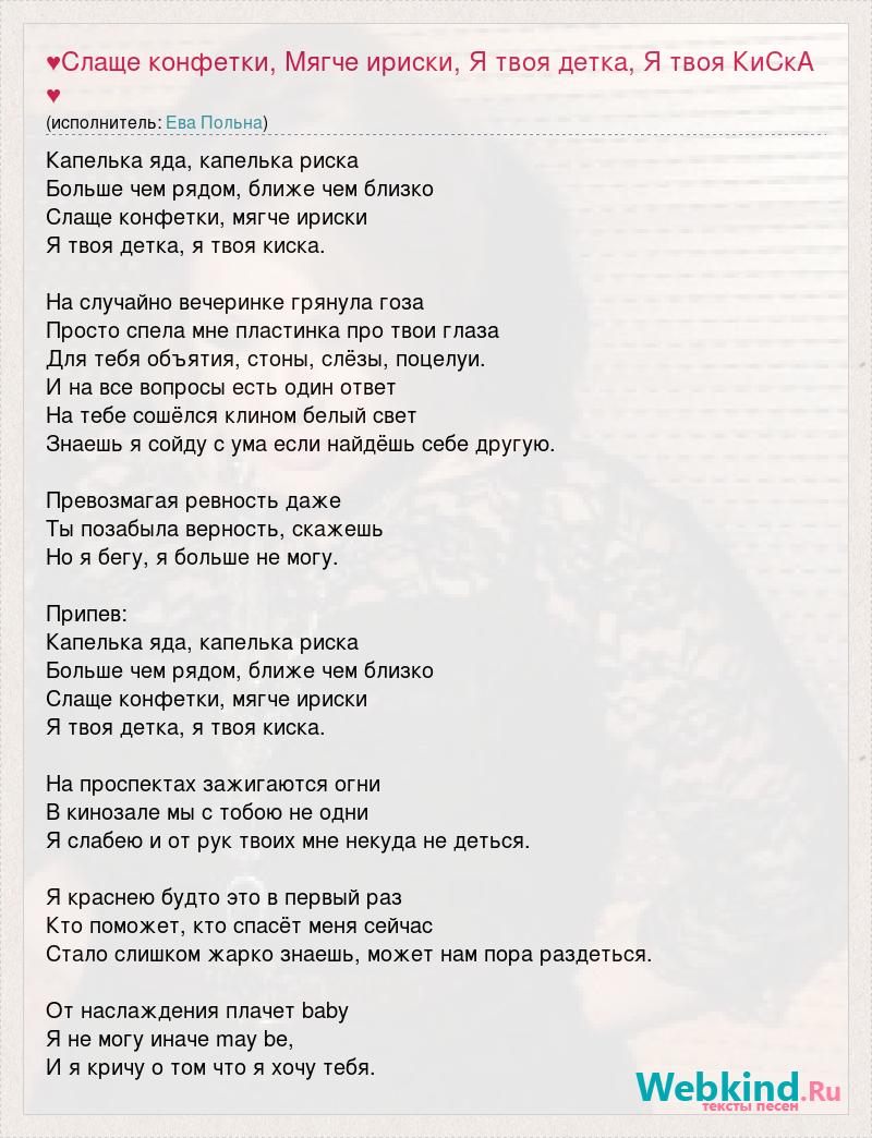 Капелька яда, капелька риска Больше чем рядом, ближе чем близко Слаще конфетки, мягче ириски Я твоя детка, я твоя киска. На случайно вечеринке грянула гоза Просто спела мне пластинка про твои глаза Для тебя объятия, стоны, слёзы, поцелуи. И на все вопросы есть один ответ На тебе сошёлся клином белый свет Знаешь я сойду с ума если найдёшь себе другую. Превозмагая ревность даже Ты позабыла верность, скажешь Но я бегу, я больше не могу. Припев: Капелька яда, капелька риска Больше чем рядом, ближе чем близко Слаще конфетки, мягче ириски Я твоя детка, я твоя киска. На проспектах зажигаются огни В кинозале мы с тобою не одни Я слабею и от рук твоих мне некуда не деться. Я краснею будто это в первый раз Кто поможет, кто спасёт меня сейчас Стало слишком жарко знаешь, может нам пора раздеться. От наслаждения плачет baby Я не могу иначе may be, И я кричу о том что я хочу тебя.