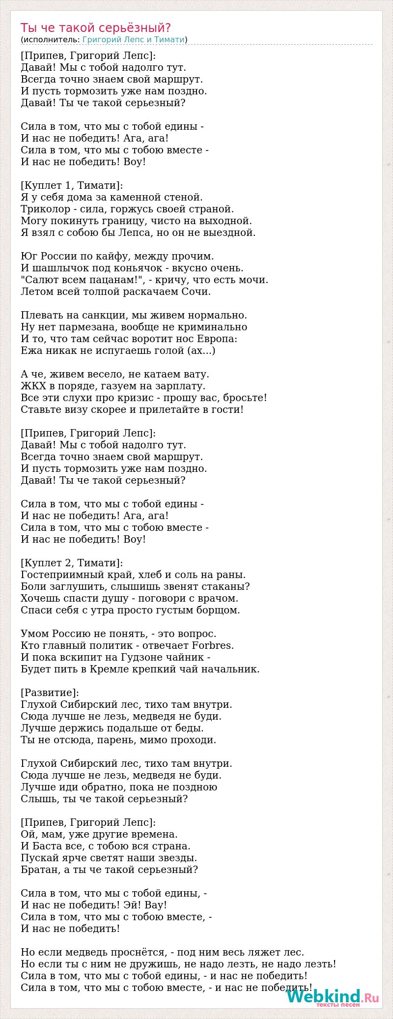 [Припев, Григорий Лепс]: Давай! Мы с тобой надолго тут. Всегда точно знаем свой маршрут. И пусть тормозить уже нам поздно. Давай! Ты че такой серьезный? Сила в том, что мы с тобой едины - И нас не победить! Ага, ага! Сила в том, что мы с тобою вместе - И нас не победить! Воу! [Куплет 1, Тимати]: Я у себя дома за каменной стеной. Триколор - сила, горжусь своей страной. Могу покинуть границу, чисто на выходной. Я взял с собою бы Лепса, но он не выездной. Юг России по кайфу, между прочим. И шашлычок под коньячок - вкусно очень. "Салют всем пацанам!", - кричу, что есть мочи. Летом всей толпой раскачаем Сочи. Плевать на санкции, мы живем нормально. Ну нет пармезана, вообще не криминально И то, что там сейчас воротит нос Европа: Ежа никак не испугаешь голой (ах...) А че, живем весело, не катаем вату. ЖКХ в поряде, газуем на зарплату. Все эти слухи про кризис - прошу вас, бросьте! Ставьте визу скорее и прилетайте в гости! [Припев, Григорий Лепс]: Давай! Мы с тобой надолго тут. Всегда точно знаем свой маршрут. И пусть тормозить уже нам поздно. Давай! Ты че такой серьезный? Сила в том, что мы с тобой едины - И нас не победить! Ага, ага! Сила в том, что мы с тобою вместе - И нас не победить! Воу! [Куплет 2, Тимати]: Гостеприимный край, хлеб и соль на раны. Боли заглушить, слышишь звенят стаканы? Хочешь спасти душу - поговори с врачом. Спаси себя с утра просто густым борщом. Умом Россию не понять, - это вопрос. Кто главный политик - отвечает Forbres. И пока вскипит на Гудзоне чайник - Будет пить в Кремле крепкий чай начальник. [Развитие]: Глухой Сибирский лес, тихо там внутри. Сюда лучше не лезь, медведя не буди. Лучше держись подальше от беды. Ты не отсюда, парень, мимо проходи. Глухой Сибирский лес, тихо там внутри. Сюда лучше не лезь, медведя не буди. Лучше иди обратно, пока не поздною Слышь, ты че такой серьезный? [Припев, Григорий Лепс]: Ой, мам, уже другие времена. И Баста все, с тобою вся страна. Пускай ярче светят наши звезды. Братан, а ты че такой серьезный? Сила в том, что мы с тобой едины, - И нас не победить! Эй! Вау! Сила в том, что мы с тобою вместе, - И нас не победить! Но если медведь проснётся, - под ним весь ляжет лес. Но если ты с ним не дружишь, не надо лезть, не надо лезть! Сила в том, что мы с тобой едины, - и нас не победить! Сила в том, что мы с тобою вместе, - и нас не победить!