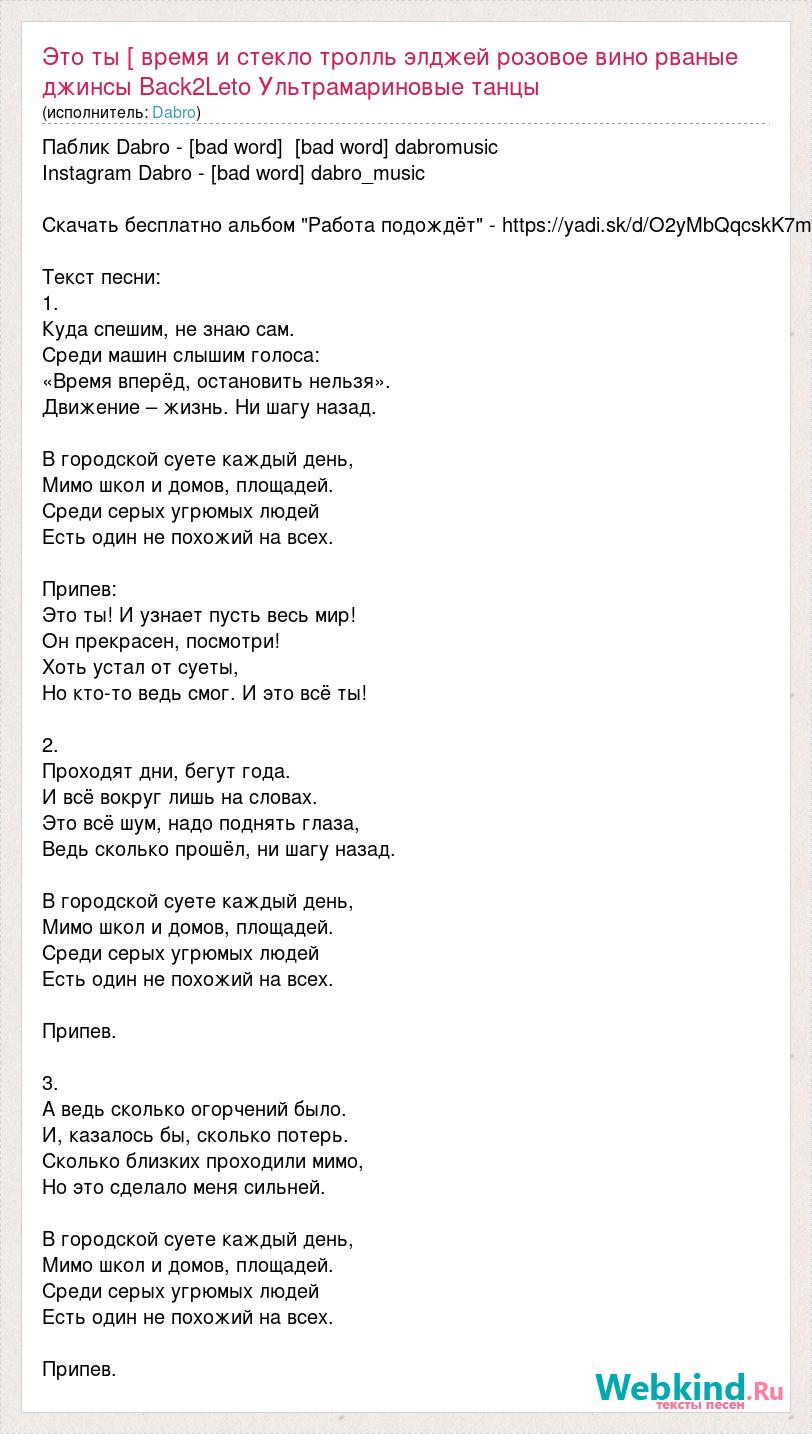 Паблик Dabro - [bad word] [bad word] dabromusic Instagram Dabro - [bad word] dabro_music Скачать бесплатно альбом "Работа подождёт" - https://yadi.sk/d/O2yMbQqcskK7m Текст песни: 1. Куда спешим, не знаю сам. Среди машин слышим голоса: «Время вперёд, остановить нельзя». Движение – жизнь. Ни шагу назад. В городской суете каждый день, Мимо школ и домов, площадей. Среди серых угрюмых людей Есть один не похожий на всех. Припев: Это ты! И узнает пусть весь мир! Он прекрасен, посмотри! Хоть устал от суеты, Но кто-то ведь смог. И это всё ты! 2. Проходят дни, бегут года. И всё вокруг лишь на словах. Это всё шум, надо поднять глаза, Ведь сколько прошёл, ни шагу назад. В городской суете каждый день, Мимо школ и домов, площадей. Среди серых угрюмых людей Есть один не похожий на всех. Припев. 3. А ведь сколько огорчений было. И, казалось бы, сколько потерь. Сколько близких проходили мимо, Но это сделало меня сильней. В городской суете каждый день, Мимо школ и домов, площадей. Среди серых угрюмых людей Есть один не похожий на всех. Припев.