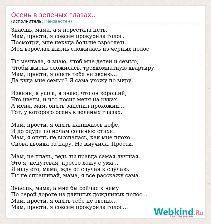 Знаешь, мама, а я перестала петь. Мам, прости, я совсем прокурила голос. Посмотри, мне некуда больше взрослеть Моя взрослая жизнь сложилась из черных полос Ты мечтала, я знаю, чтоб мне детей и семью, Чтобы жизнь сложилась, трехкомнатную квартиру. Мам, прости, я опять тебе не звоню… Да куда мне семью? Я сама ухожу по миру… Извини, я ушла, я знаю, что он хороший, Что цветы, и что носит меня на руках. А меня, мам, опять зацепил прохожий… Тот, у которого осень в зеленых глазах. Мам, прости, я опять напиваюсь кофе, И до одури по ночам сочиняю стихи. Мам, я опять не выспалась, как мне плохо… Снова двойка за пару. Не выучила. Прости. Мам, не плачь, ведь ты правда самая лучшая. Это я, непутевая, просто хожу с ума… Я ищу его, мама, жду от случая к случаю. Ты не спрашивай, мама, я все расскажу сама. Знаешь, мама, а мне бы сейчас к нему По серой дороге из длинных дождливых полос… Мам, прости, я опять тебе не звоню… Мам, прости, я совсем прокурила голос…