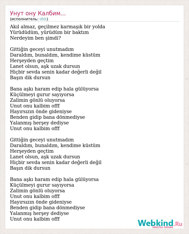 Akıl almaz, geçilmez karmaşık bir yolda Yürüdüdüm, yürüdüm bir baktım Nerdeyim ben şimdi? Gittiğin geceyi unutmadım Daraldım, bunaldım, kendime küstüm Herşeyden geçtim Lanet olsun, aşk uzak dursun Hiçbir sevda senin kadar değerli değil Başın dik dursun Bana aşkı haram edip hala gülüyorsa Küçülmeyi gurur sayıyorsa Zalimin gönlü oluyorsa Unut onu kalbim offf Hayırsızın önde gideniyse Benden gidip bana dönmediyse Yalanmış herşey dediyse Unut onu kalbim offf Gittiğin geceyi unutmadım Daraldım, bunaldım, kendime küstüm Herşeyden geçtim Lanet olsun, aşk uzak dursun Hiçbir sevda senin kadar değerli değil Başın dik dursun Bana aşkı haram edip hala gülüyorsa Küçülmeyi gurur sayıyorsa Zalimin gönlü oluyorsa Unut onu kalbim offf Hayırsızın önde gideniyse Benden gidip bana dönmediyse Yalanmış herşey dediyse Unut onu kalbim offf