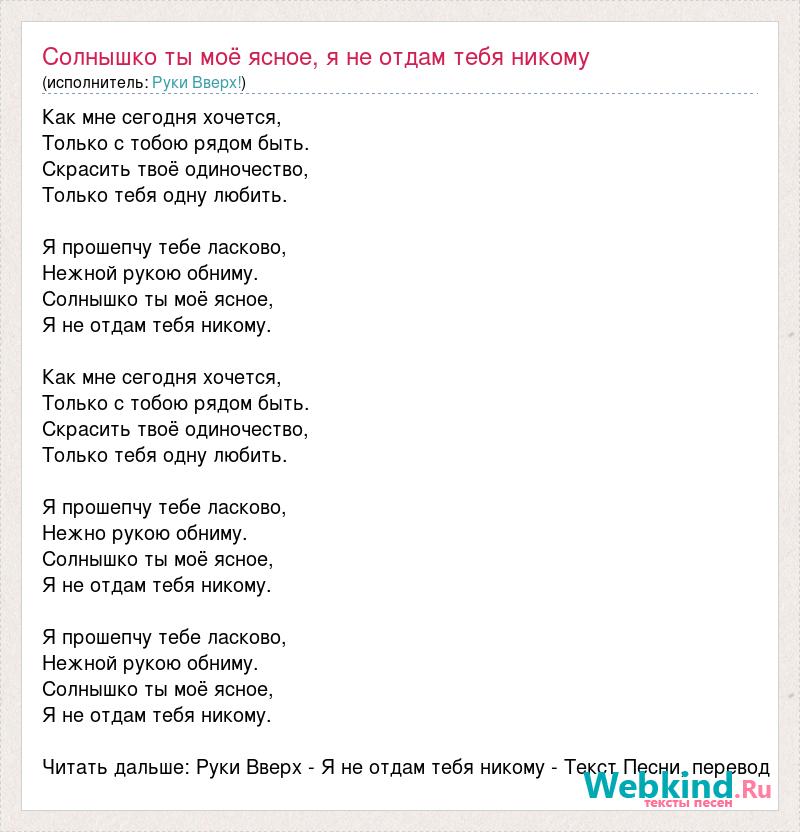 Как мне сегодня хочется, Только с тобою рядом быть. Скрасить твоё одиночество, Только тебя одну любить. Я прошепчу тебе ласково, Нежной рукою обниму. Солнышко ты моё ясное, Я не отдам тебя никому. Как мне сегодня хочется, Только с тобою рядом быть. Скрасить твоё одиночество, Только тебя одну любить. Я прошепчу тебе ласково, Нежно рукою обниму. Солнышко ты моё ясное, Я не отдам тебя никому. Я прошепчу тебе ласково, Нежной рукою обниму. Солнышко ты моё ясное, Я не отдам тебя никому. Читать дальше: Руки Вверх - Я не отдам тебя никому - Текст Песни, перевод