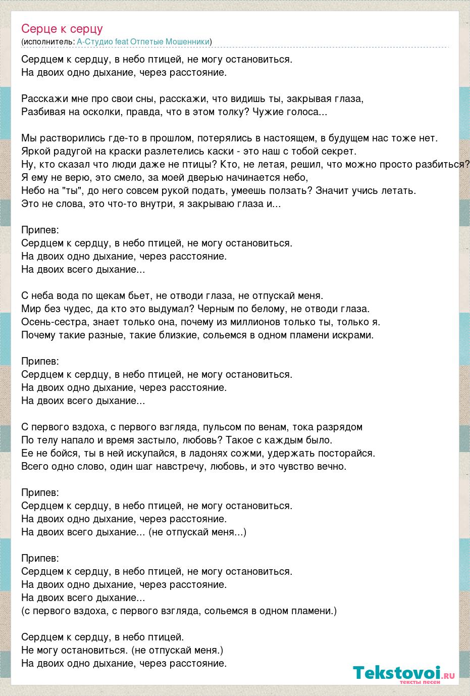 Сердцем к сердцу, в небо птицей, не могу остановиться. На двоих одно дыхание, через расстояние. Расскажи мне про свои сны, расскажи, что видишь ты, закрывая глаза, Разбивая на осколки, правда, что в этом толку? Чужие голоса... Мы растворились где-то в прошлом, потерялись в настоящем, в будущем нас тоже нет. Яркой радугой на краски разлетелись каски - это наш с тобой секрет. Ну, кто сказал что люди даже не птицы? Кто, не летая, решил, что можно просто разбиться? Я ему не верю, это смело, за моей дверью начинается небо, Небо на "ты", до него совсем рукой подать, умеешь ползать? Значит учись летать. Это не слова, это что-то внутри, я закрываю глаза и... Припев: Сердцем к сердцу, в небо птицей, не могу остановиться. На двоих одно дыхание, через расстояние. На двоих всего дыхание... С неба вода по щекам бьет, не отводи глаза, не отпускай меня. Мир без чудес, да кто это выдумал? Черным по белому, не отводи глаза. Осень-сестра, знает только она, почему из миллионов только ты, только я. Почему такие разные, такие близкие, сольемся в одном пламени искрами. Припев: Сердцем к сердцу, в небо птицей, не могу остановиться. На двоих одно дыхание, через расстояние. На двоих всего дыхание... С первого вздоха, с первого взгляда, пульсом по венам, тока разрядом По телу напало и время застыло, любовь? Такое с каждым было. Ее не бойся, ты в ней искупайся, в ладонях сожми, удержать посторайся. Всего одно слово, один шаг навстречу, любовь, и это чувство вечно. Припев: Сердцем к сердцу, в небо птицей, не могу остановиться. На двоих одно дыхание, через расстояние. На двоих всего дыхание... (не отпускай меня...) Припев: Сердцем к сердцу, в небо птицей, не могу остановиться. На двоих одно дыхание, через расстояние. На двоих всего дыхание... (с первого вздоха, с первого взгляда, сольемся в одном пламени.) Сердцем к сердцу, в небо птицей. Не могу остановиться. (не отпускай меня.) На двоих одно дыхание, через расстояние.