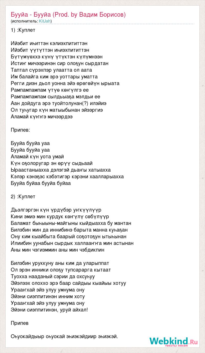 1) :Куплет Ийэбит иһиттэн кэлиэхпититтэн Ийэбит үүтүттэн иһиэхпититтэн Бүтүмүөххэ күнү үтүктэн күлүмнээн Истиҥ мичээринэн сир олоҕун сырдатан Таптал сүрэхпэр улаатта ол аата Им балайга ким эрэ уоттары уматта Регги диэн дьол уонна эйэ өрөгөйүн ырыата Рампампампам үтүө көҥүлгэ ее Рампампампам сылдьыаҕа мэлдьи ее Аан дойдуга эрэ туойтолунан(?) илэйиэ Ол туһугар күн матыыбынан эйээргиэ Аламай күҥҥэ мичээрдээ Припев: Бууйа бууйа уаа Бууйа бууйа уаа Аламай күн уота умай Күн оҕолоругар эн өрүү сыдьаай Ыраастаныахха дэлэгэй дьаҥы хатыахха Кэлэр кэнэҕэс кэбэтигэр кэрэни хаалларыахха Бууйа буйаа бууйа буйаа 2) :Куплет Дьэлгэргэн күн үрдүбэр уҥкүүлүүр Кини эмиэ мин курдук көҥүлү сөбүлүүр Баламат быһыыны-майгыны кыйдыахха бу мантан Билэбин мин да иннибинэ барыта манна куһаҕан Ону ким кыайбыта баарый соҕотоҕун ытыһынан Илиибин уунабын сырдык халлааҥҥа мин астынан Аны мин чэгиэммин аны мин чэбдикпин Билэбин уруккуну аны ким да уларыппат Ол эрэн инники олоҕу тупсарарга кытаат Туохха нааданый сэрии да охсуһуу Эйэлээх олоххо эрэ баар сайдыы кыайыы хотуу Урааҥхай эйэ улуу умнума ону Эйэни сиэппитинэн инним хоту Урааҥхай эйэ улуу умнума ону Эйэни сиэппитинэн, уруй айхал! Припев Оһуокайдыыр оһуокай эһиэкэйдиир эһиэкэй.