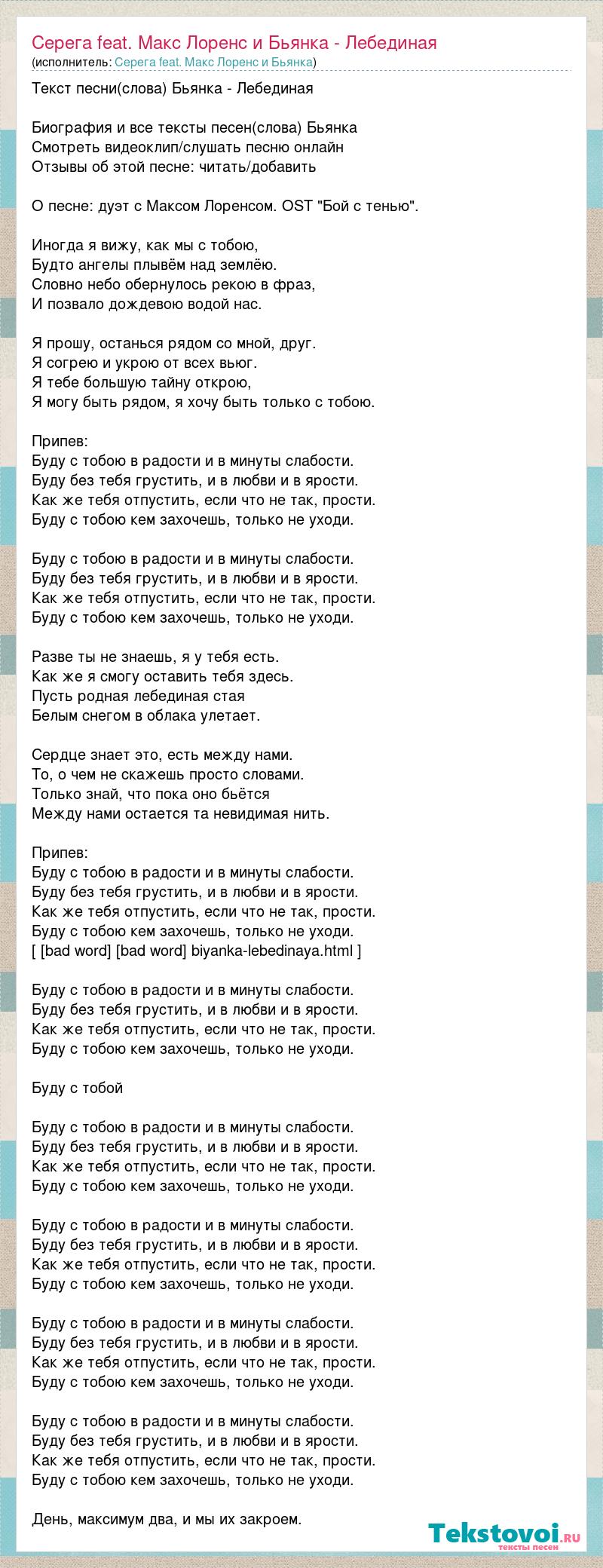 Текст песни(слова) Бьянка - Лебединая Биография и все тексты песен(слова) Бьянка Смотреть видеоклип/слушать песню онлайн Отзывы об этой песне: читать/добавить О песне: дуэт с Максом Лоренсом. OST "Бой с тенью". Иногда я вижу, как мы с тобою, Будто ангелы плывём над землёю. Словно небо обернулось рекою в фраз, И позвало дождевою водой нас. Я прошу, останься рядом со мной, друг. Я согрею и укрою от всех вьюг. Я тебе большую тайну открою, Я могу быть рядом, я хочу быть только с тобою. Припев: Буду с тобою в радости и в минуты слабости. Буду без тебя грустить, и в любви и в ярости. Как же тебя отпустить, если что не так, прости. Буду с тобою кем захочешь, только не уходи. Буду с тобою в радости и в минуты слабости. Буду без тебя грустить, и в любви и в ярости. Как же тебя отпустить, если что не так, прости. Буду с тобою кем захочешь, только не уходи. Разве ты не знаешь, я у тебя есть. Как же я смогу оставить тебя здесь. Пусть родная лебединая стая Белым снегом в облака улетает. Сердце знает это, есть между нами. То, о чем не скажешь просто словами. Только знай, что пока оно бьётся Между нами остается та невидимая нить. Припев: Буду с тобою в радости и в минуты слабости. Буду без тебя грустить, и в любви и в ярости. Как же тебя отпустить, если что не так, прости. Буду с тобою кем захочешь, только не уходи. [ [bad word] [bad word] biyanka-lebedinaya.html ] Буду с тобою в радости и в минуты слабости. Буду без тебя грустить, и в любви и в ярости. Как же тебя отпустить, если что не так, прости. Буду с тобою кем захочешь, только не уходи. Буду с тобой Буду с тобою в радости и в минуты слабости. Буду без тебя грустить, и в любви и в ярости. Как же тебя отпустить, если что не так, прости. Буду с тобою кем захочешь, только не уходи. Буду с тобою в радости и в минуты слабости. Буду без тебя грустить, и в любви и в ярости. Как же тебя отпустить, если что не так, прости. Буду с тобою кем захочешь, только не уходи. Буду с тобою в радости и в минуты слабости. Буду без тебя грустить, и в любви и в ярости. Как же тебя отпустить, если что не так, прости. Буду с тобою кем захочешь, только не уходи. Буду с тобою в радости и в минуты слабости. Буду без тебя грустить, и в любви и в ярости. Как же тебя отпустить, если что не так, прости. Буду с тобою кем захочешь, только не уходи. День, максимум два, и мы их закроем.