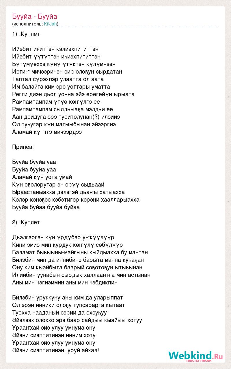 1) :Куплет Ийэбит иһиттэн кэлиэхпититтэн Ийэбит үүтүттэн иһиэхпититтэн Бүтүмүөххэ күнү үтүктэн күлүмнээн Истиҥ мичээринэн сир олоҕун сырдатан Таптал сүрэхпэр улаатта ол аата Им балайга ким эрэ уоттары уматта Регги диэн дьол уонна эйэ өрөгөйүн ырыата Рампампампам үтүө көҥүлгэ ее Рампампампам сылдьыаҕа мэлдьи ее Аан дойдуга эрэ туойтолунан(?) илэйиэ Ол туһугар күн матыыбынан эйээргиэ Аламай күҥҥэ мичээрдээ Припев: Бууйа бууйа уаа Бууйа бууйа уаа Аламай күн уота умай Күн оҕолоругар эн өрүү сыдьаай Ыраастаныахха дэлэгэй дьаҥы хатыахха Кэлэр кэнэҕэс кэбэтигэр кэрэни хаалларыахха Бууйа буйаа бууйа буйаа 2) :Куплет Дьэлгэргэн күн үрдүбэр уҥкүүлүүр Кини эмиэ мин курдук көҥүлү сөбүлүүр Баламат быһыыны-майгыны кыйдыахха бу мантан Билэбин мин да иннибинэ барыта манна куһаҕан Ону ким кыайбыта баарый соҕотоҕун ытыһынан Илиибин уунабын сырдык халлааҥҥа мин астынан Аны мин чэгиэммин аны мин чэбдикпин Билэбин уруккуну аны ким да уларыппат Ол эрэн инники олоҕу тупсарарга кытаат Туохха нааданый сэрии да охсуһуу Эйэлээх олоххо эрэ баар сайдыы кыайыы хотуу Урааҥхай эйэ улуу умнума ону Эйэни сиэппитинэн инним хоту Урааҥхай эйэ улуу умнума ону Эйэни сиэппитинэн, уруй айхал!