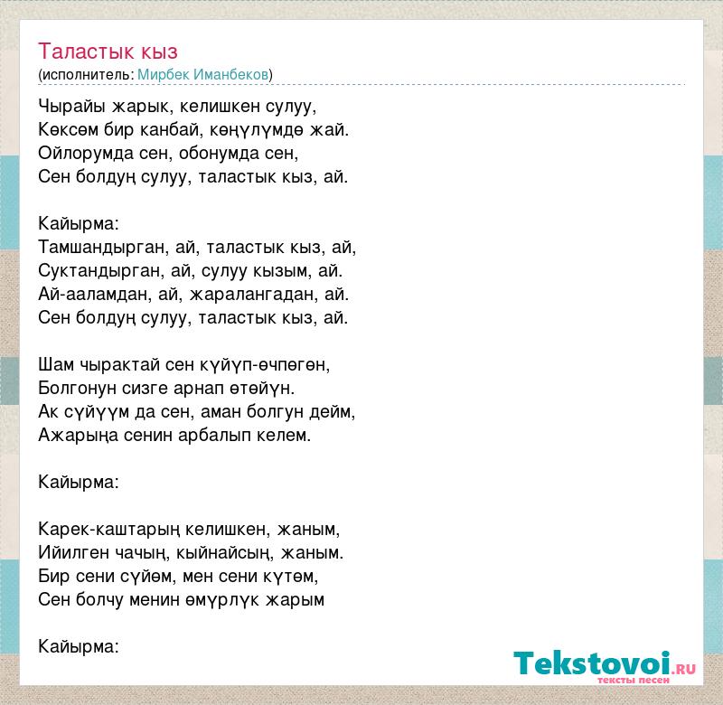 Чырайы жарык, келишкен сулуу, Көксөм бир канбай, көңүлүмдө жай. Ойлорумда сен, обонумда сен, Сен болдуң сулуу, таластык кыз, ай. Кайырма: Тамшандырган, ай, таластык кыз, ай, Суктандырган, ай, сулуу кызым, ай. Ай-ааламдан, ай, жаралангадан, ай. Сен болдуң сулуу, таластык кыз, ай. Шам чырактай сен күйүп-өчпөгөн, Болгонун сизге арнап өтөйүн. Ак сүйүүм да сен, аман болгун дейм, Ажарыңа сенин арбалып келем. Кайырма: Карек-каштарың келишкен, жаным, Ийилген чачың, кыйнайсың, жаным. Бир сени сүйөм, мен сени күтөм, Сен болчу менин өмүрлүк жарым Кайырма: