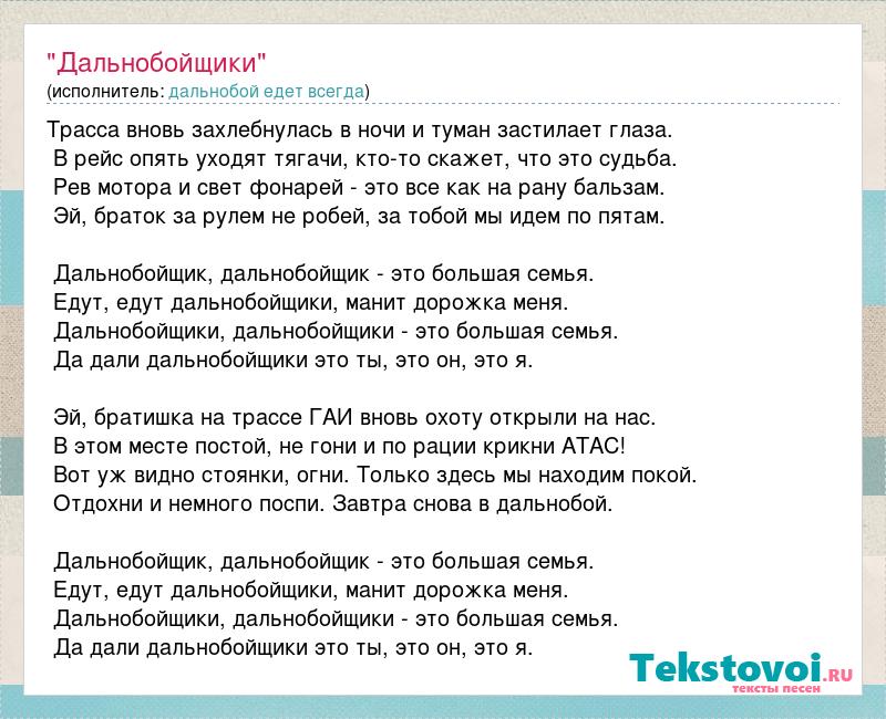 Трасса вновь захлебнулась в ночи и туман застилает глаза. В рейс опять уходят тягачи, кто-то скажет, что это судьба. Рев мотора и свет фонарей - это все как на рану бальзам. Эй, браток за рулем не робей, за тобой мы идем по пятам. Дальнобойщик, дальнобойщик - это большая семья. Едут, едут дальнобойщики, манит дорожка меня. Дальнобойщики, дальнобойщики - это большая семья. Да дали дальнобойщики это ты, это он, это я. Эй, братишка на трассе ГАИ вновь охоту открыли на нас. В этом месте постой, не гони и по рации крикни АТАС! Вот уж видно стоянки, огни. Только здесь мы находим покой. Отдохни и немного поспи. Завтра снова в дальнобой. Дальнобойщик, дальнобойщик - это большая семья. Едут, едут дальнобойщики, манит дорожка меня. Дальнобойщики, дальнобойщики - это большая семья. Да дали дальнобойщики это ты, это он, это я.