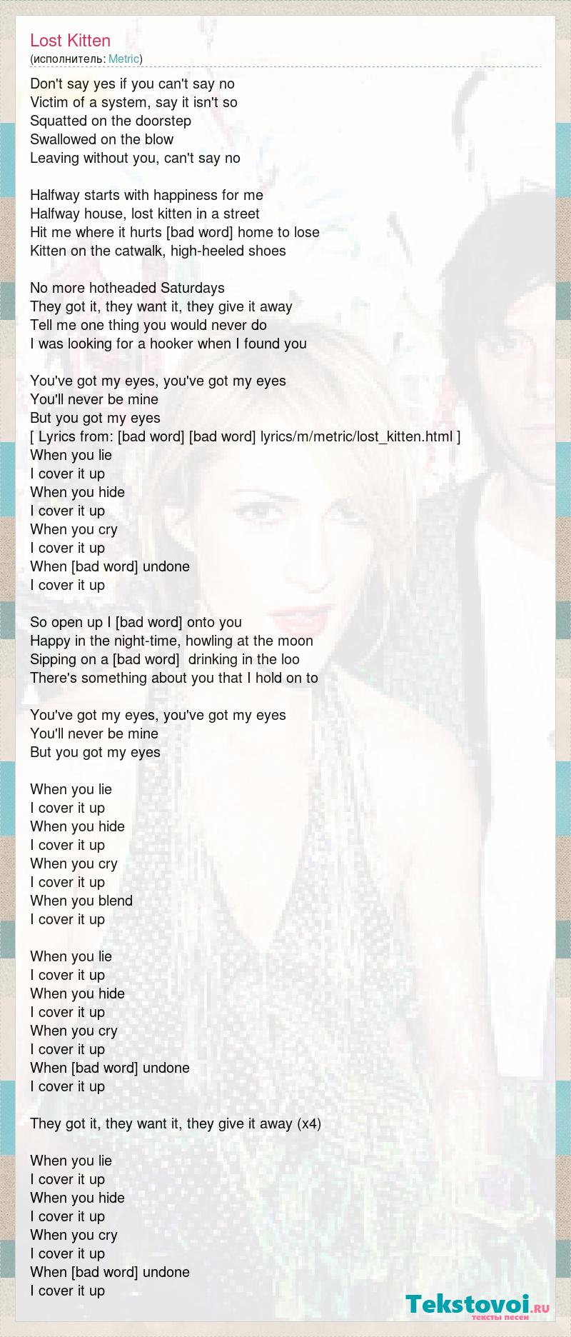 Don't say yes if you can't say no Victim of a system, say it isn't so Squatted on the doorstep Swallowed on the blow Leaving without you, can't say no Halfway starts with happiness for me Halfway house, lost kitten in a street Hit me where it hurts [bad word] home to lose Kitten on the catwalk, high-heeled shoes No more hotheaded Saturdays They got it, they want it, they give it away Tell me one thing you would never do I was looking for a hooker when I found you You've got my eyes, you've got my eyes You'll never be mine But you got my eyes [ Lyrics from: [bad word] [bad word] lyrics/m/metric/lost_kitten.html ] When you lie I cover it up When you hide I cover it up When you cry I cover it up When [bad word] undone I cover it up So open up I [bad word] onto you Happy in the night-time, howling at the moon Sipping on a [bad word] drinking in the loo There's something about you that I hold on to You've got my eyes, you've got my eyes You'll never be mine But you got my eyes When you lie I cover it up When you hide I cover it up When you cry I cover it up When you blend I cover it up When you lie I cover it up When you hide I cover it up When you cry I cover it up When [bad word] undone I cover it up They got it, they want it, they give it away (x4) When you lie I cover it up When you hide I cover it up When you cry I cover it up When [bad word] undone I cover it up